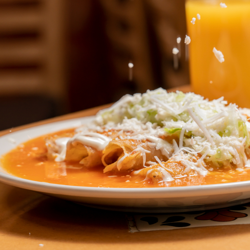 Rellenas de pechuga de pollo deshebrada bañadas en Caldillo de tomate sazonado con chiles habaneros. Servidas con lechuga, crema y queso rallado.