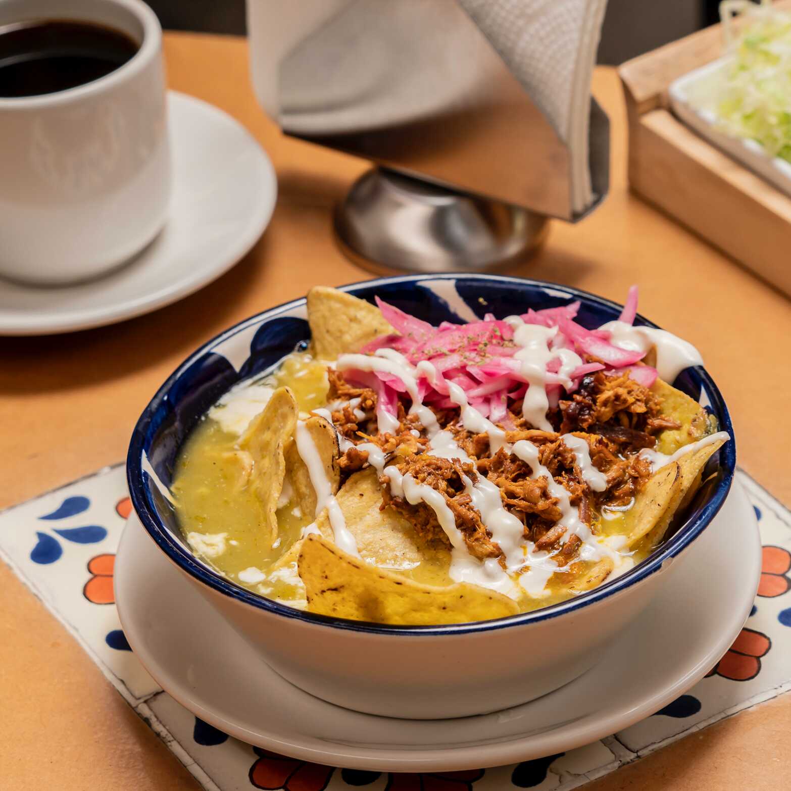 Totopos de maíz dorados al momento bañados en salsa de tu elección, acompañados con lechuga, crema y queso rallado.