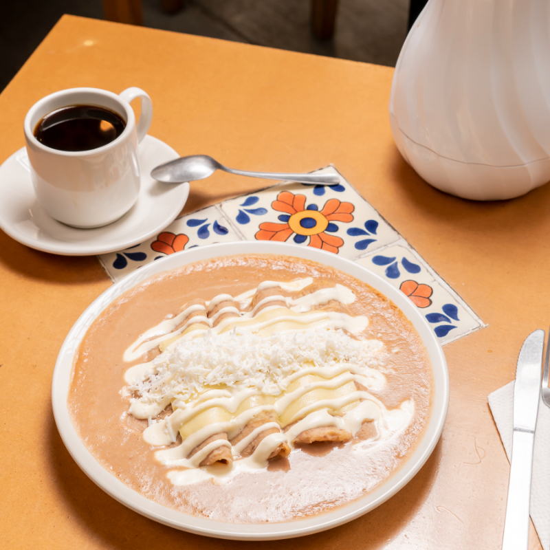 Las tradicio nales enfrijoladas gratinadas con queso manchego acompañadas con crema y queso rallado.
