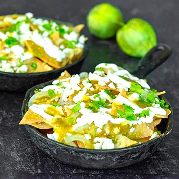 Deliciosos y crujientes totopos en salsa verde picosita coronados con la proteína de tu elección, crema, queso blanco, cebolla y cilantro.
