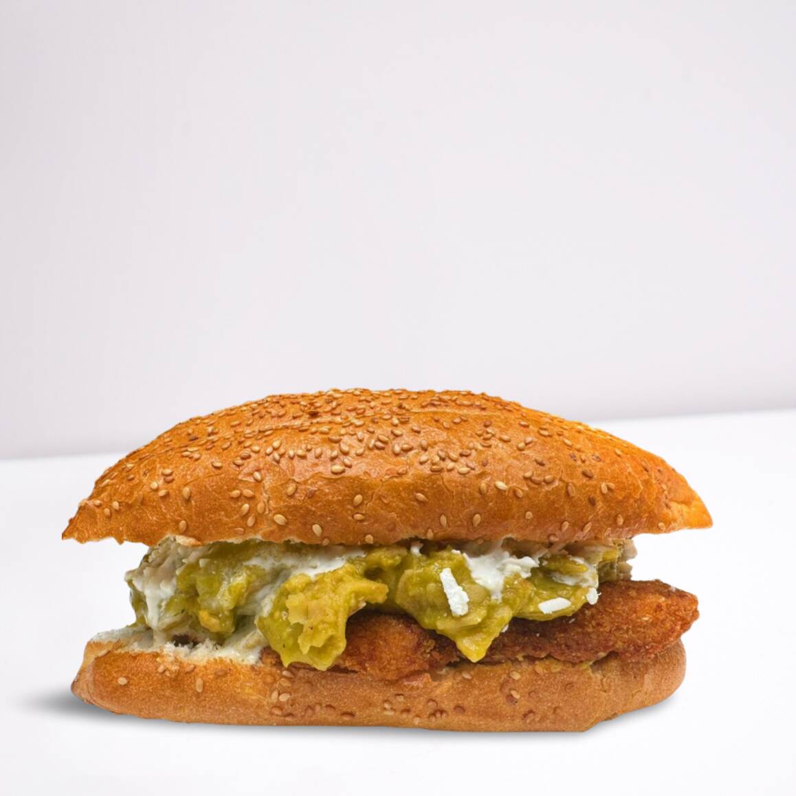 casi 25 cm de pan de ajonjoli , con deliciosa milanesa , jitomate, aguacate, mayonesa, cebolla, frijoles, queso , crema y deliciosa salsa verde tatemada. incluye bebida a elegir