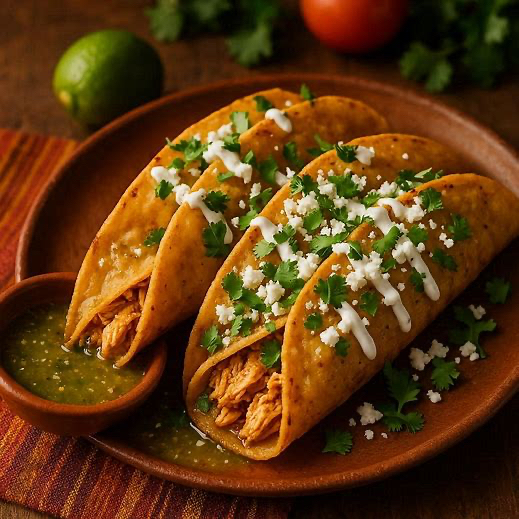 4 DELICIOSOS TACOS DORADOS RELLENOS DE POLLO SAZONADOS EN SALSA DE JITOMATE CON TOQUE CASERO, SUMERGIDOS EN NUESTRA DELICIOSA SALSA VERDE PICOSITA Y CORONADOS CON QUESO, CREMA, CILANTRO Y CEBOLLA.