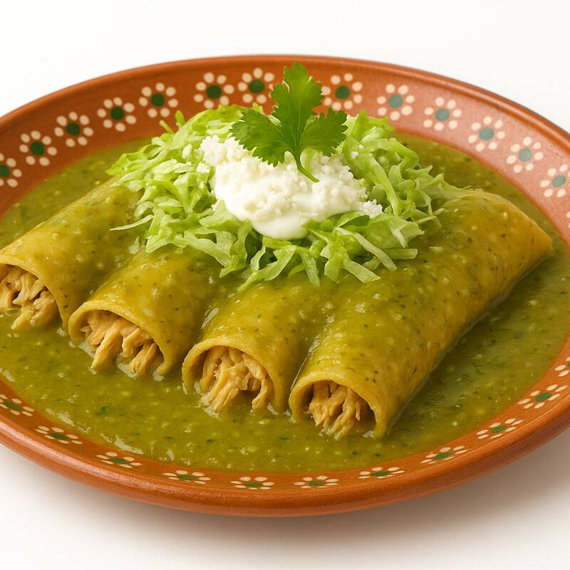 4 deliciosas enchiladas rellenas de pollo, bien salseadas y coronadas con queso crema cebolla lechuga y cilantro.