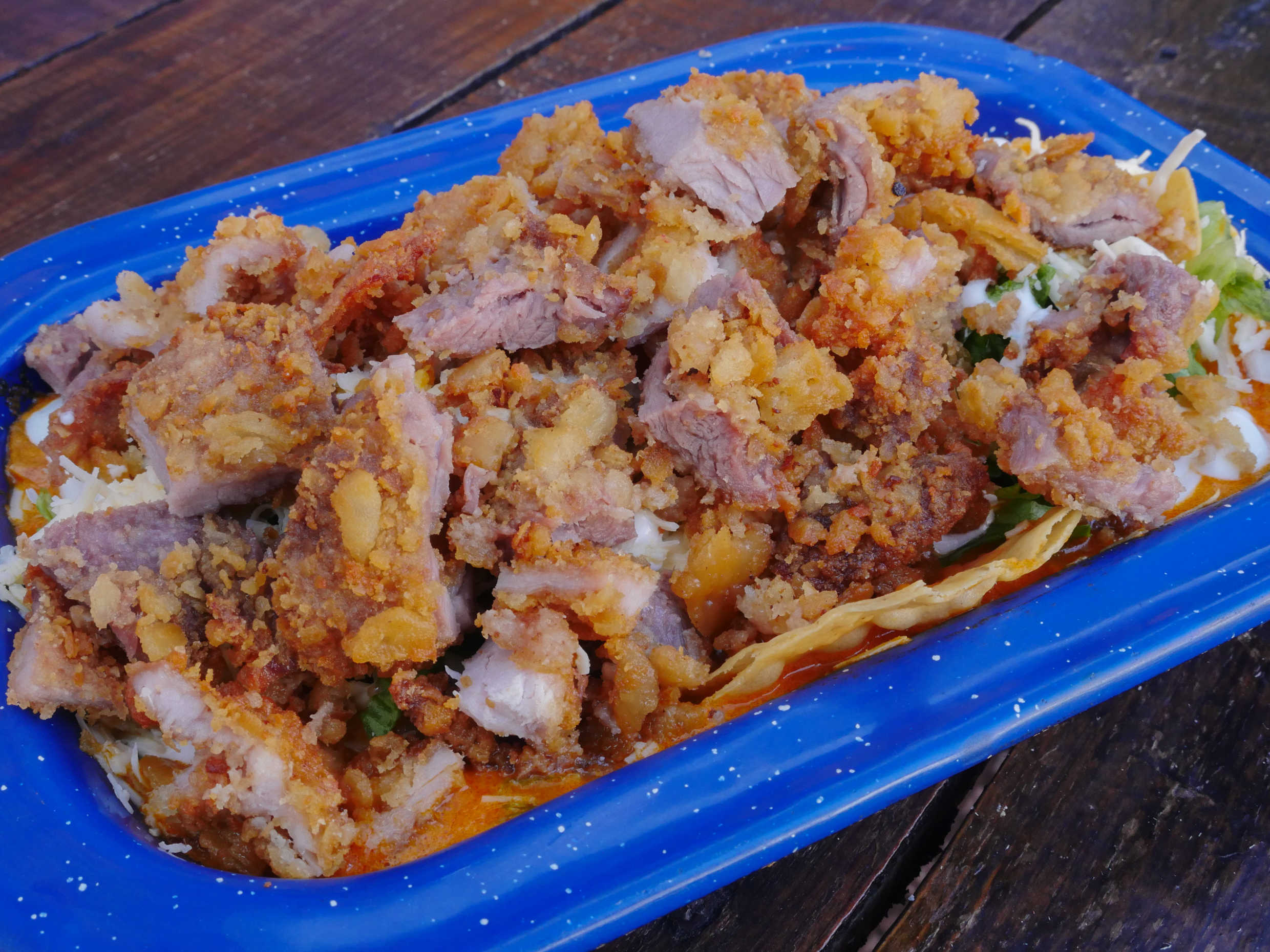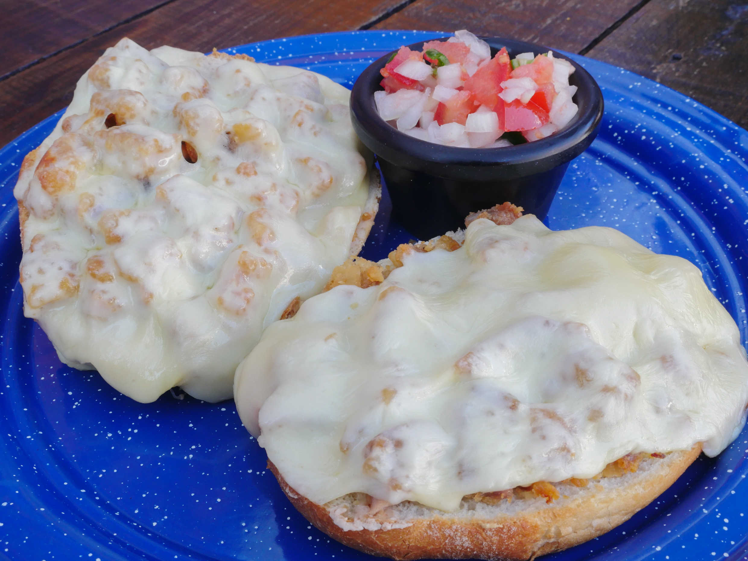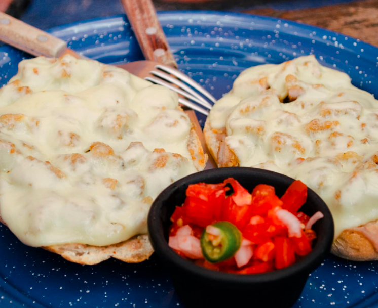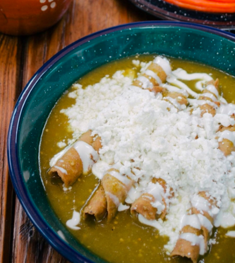 Tacos dorados de pollo, ahogados en tu salsa preferida, acompañados de queso doble crema.