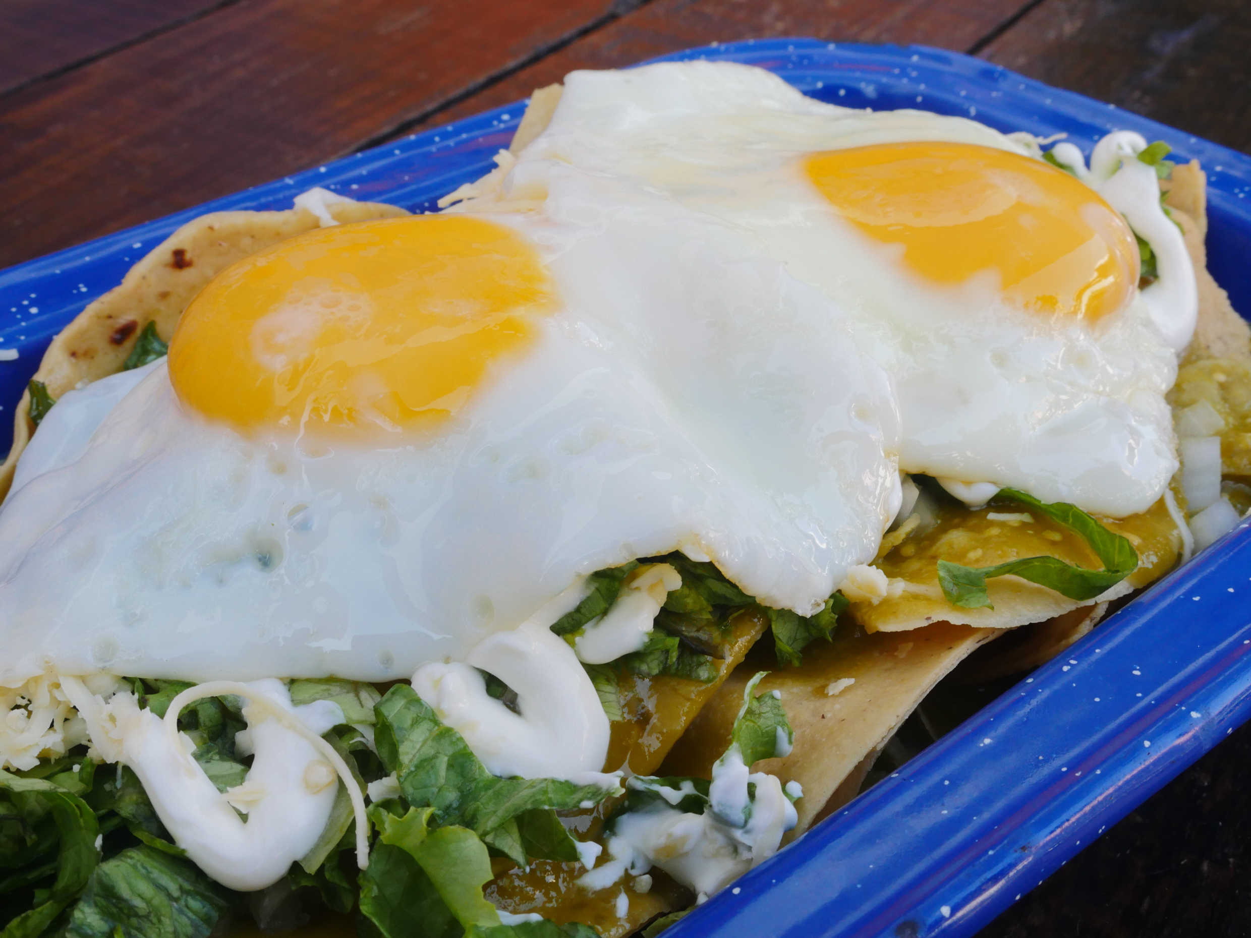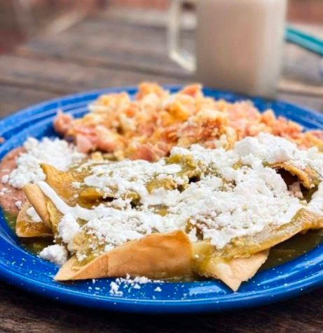 Frijoles refritos, queso manchego, chilaquiles con la salsa de tu elección.