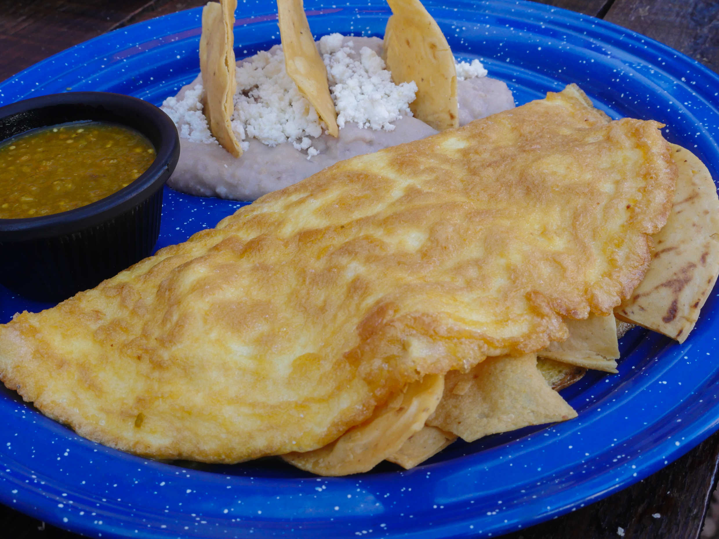 Omelette relleno de chilaquiles de la casa, queso manchego y acompañado de frijoles refritos.
