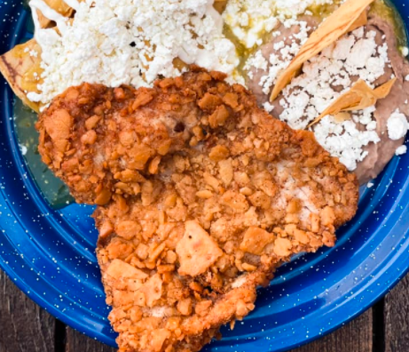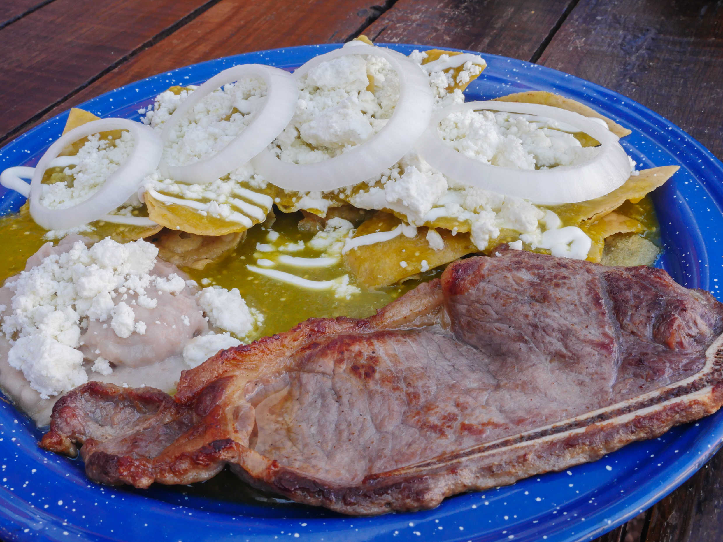 Costilla de res acompañada de chilaquiles de la casa y frijoles refritos.