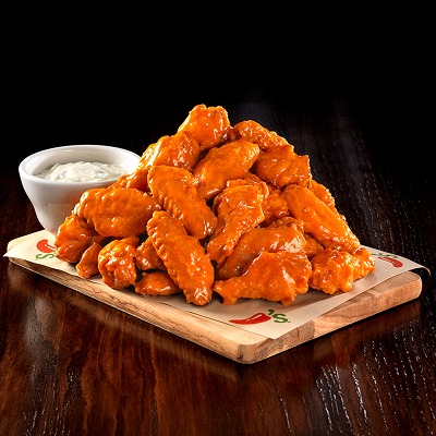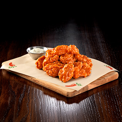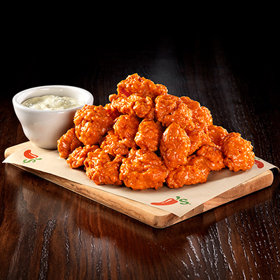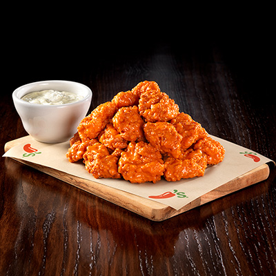 Cubitos de pechuga de pollo empanizados, bañados con salsa de tu elección. Servidos con aderezo Bleu cheese 20 piezas.