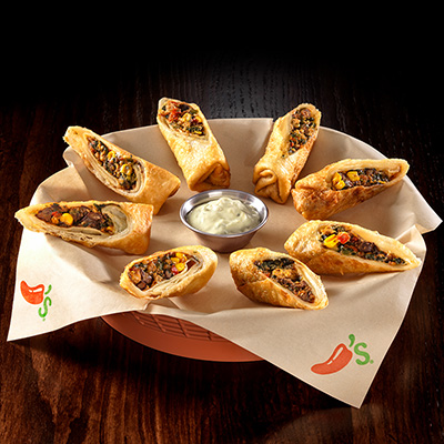 Rollos de hojaldre rellenos de pollo ahumado, frijoles negros, granos de elote, queso Monterey Jack, pimiento rojo y espinaca. Acompañados de aderezo avocado rach (8 mitades).