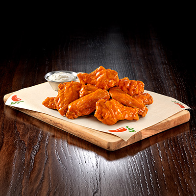 Nuestras deliciosas wings, bañadas con la salsa de tu elección. Servidas con aderezo bleu cheese 530g (8 a 10 piezas)