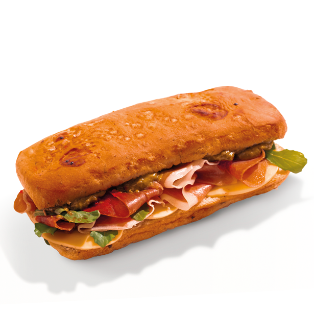 Sandwich de hogaza de granos con pechuga de pavo, queso panela, espinaca, jitomate rostizado y aderezo al pesto.