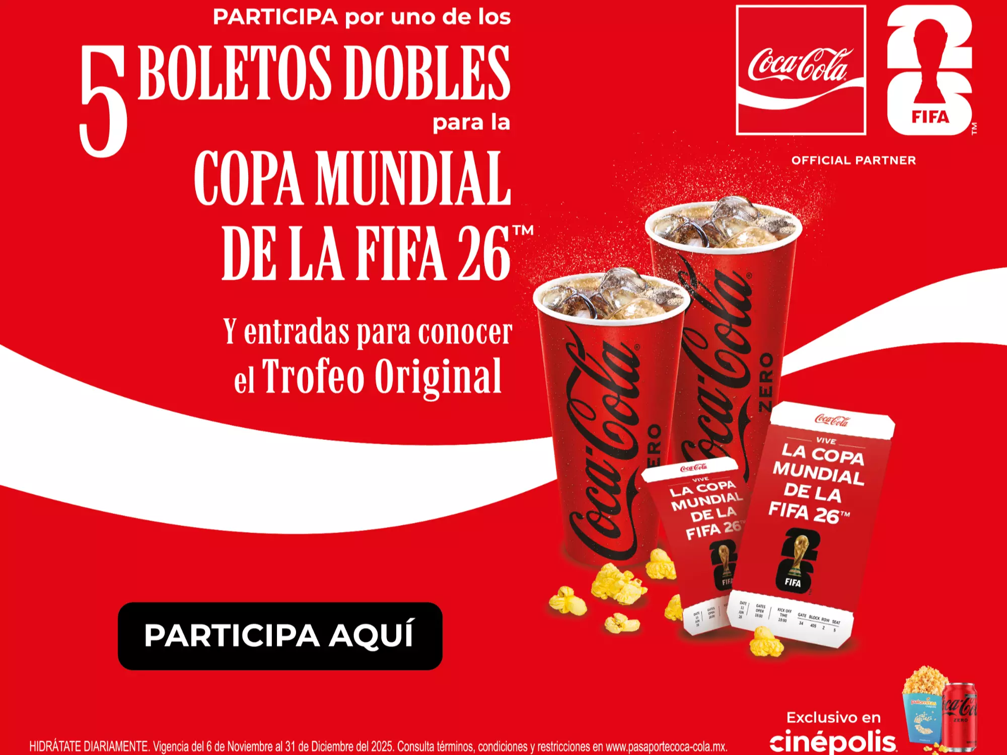 1 palomitas para llevar Cinépolis® + 2 latas de refresco Coca- Cola® 355 ml + 1 Hot Dog + 1 Nachos Cinépolis® + tu postre favorito.