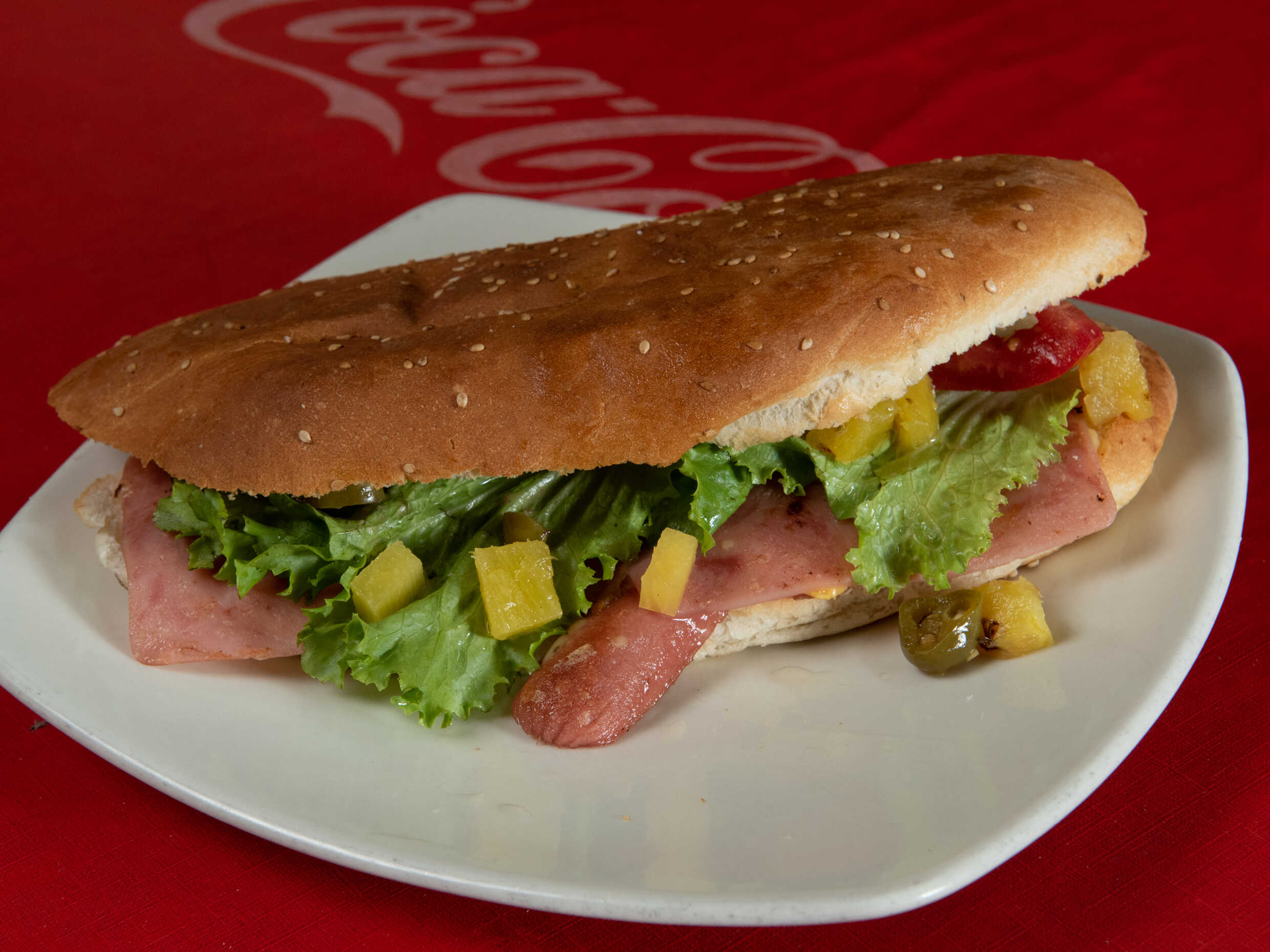 Salchicha, jamón, queso manchego, queso amarillo y piña.