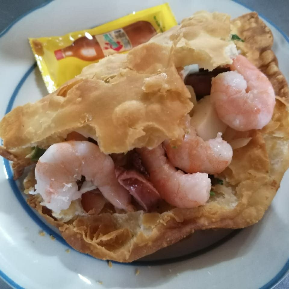 Camarón, pulpo, calamar, piña y queso gratinado.