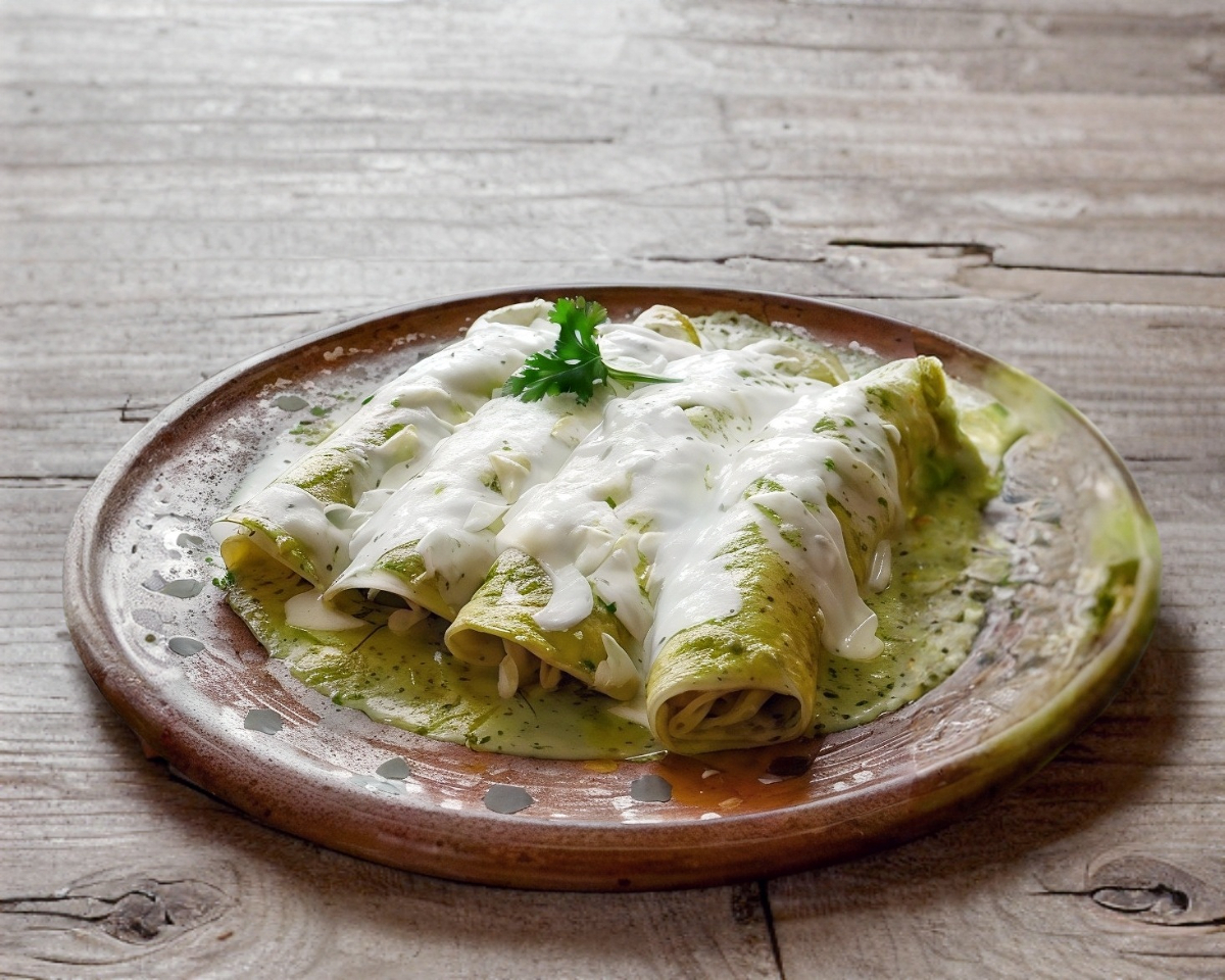 Tacos dorados rellenos de pollo o de mole verde, con lechuga, crema, queso, salsa