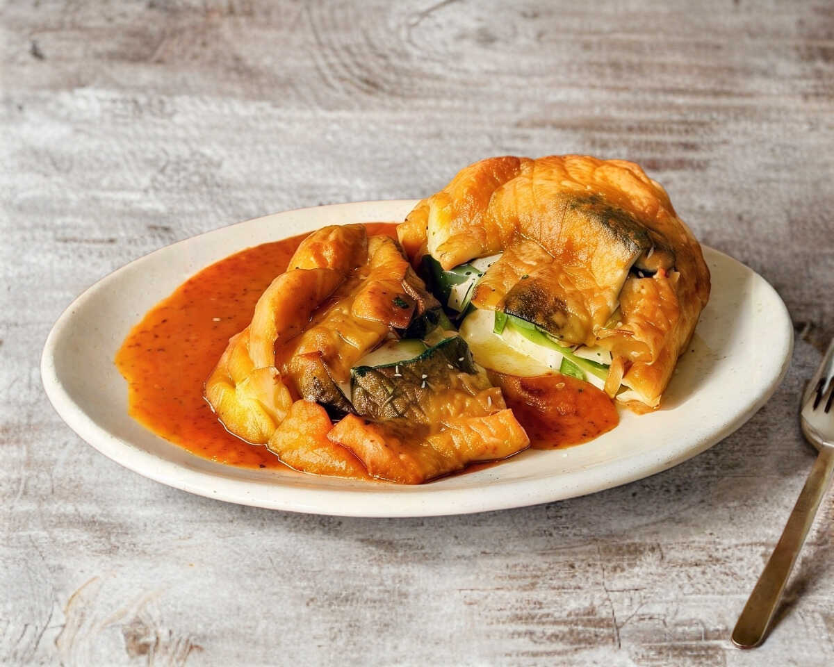 Pechuga empanizada frita de 100gramos en cruda , Rellena de jamón y queso manchego. Acompañado de 2 complementos a elegir
