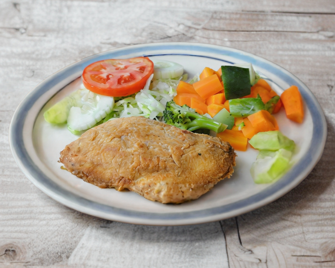 Pechuga asada de 100 gramos ( peso en crudo) acompañado de 2 complementos a elegir