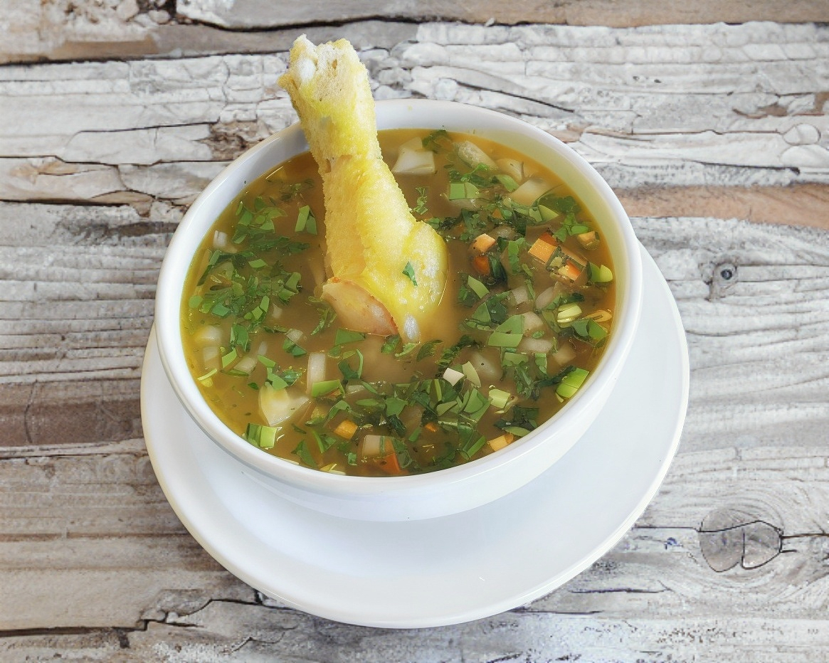Dos piezas de pollo, pierna o muslo en caldo con zanahoria calabaza y brócoli.