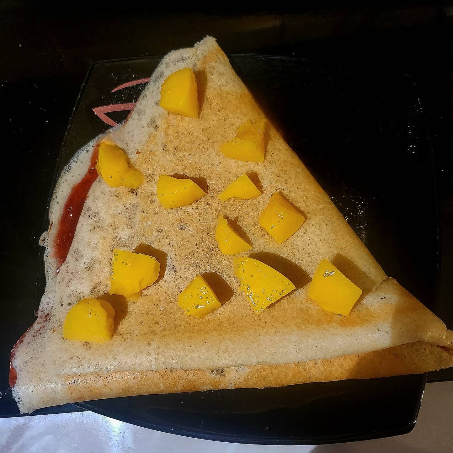 Crepa rellena de nutella con durazno en almibar y puedes escoger un extra de cajeta, mermelada de zarzamora o mermelada de fresa