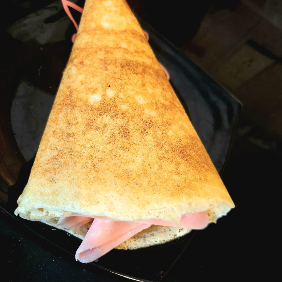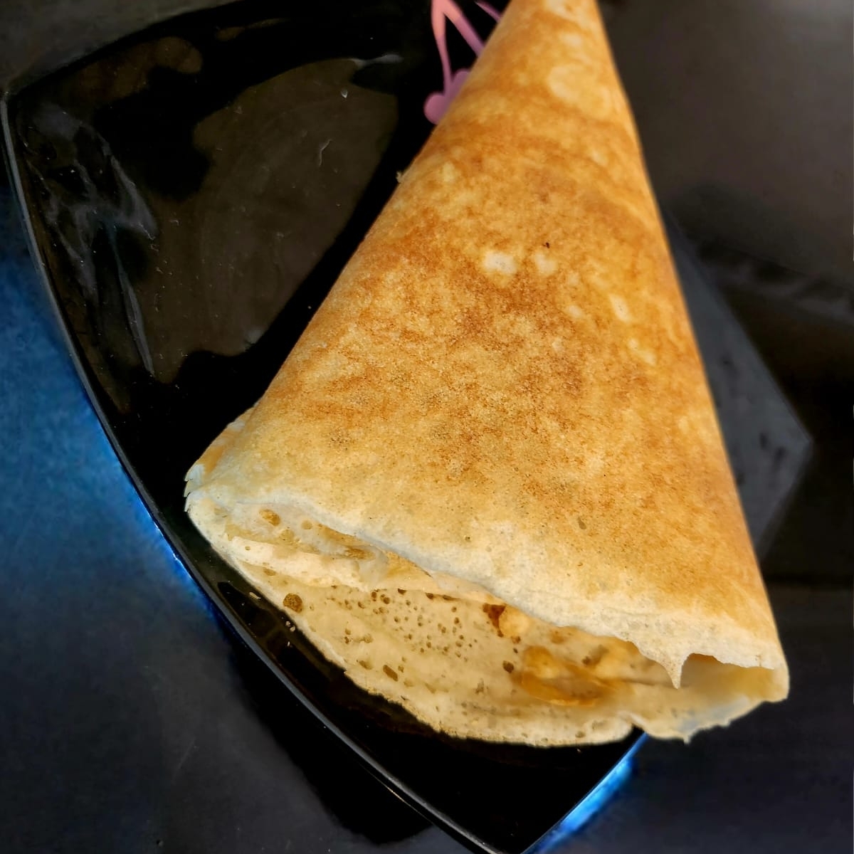 Crepa de Queso Philadelphia con duraznos en almibar y puedes escoger un extra de cajeta, mermelada de zarzamora o mermelada de fresa