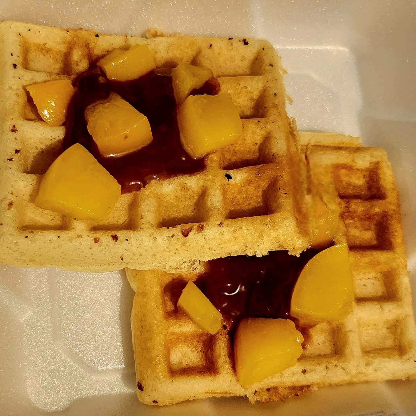2 piezas de Waffles con durazno en almibar y cajeta, mermelada de zarzamora o mermelada de fresa