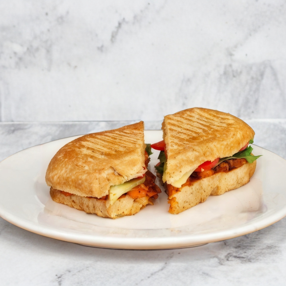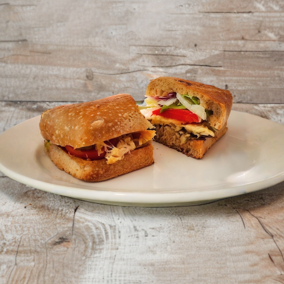 Pan de masa madre, pechuga de pollo asada, frijoles refritos de la casa, queso cheddar lechuga y jitomate.
