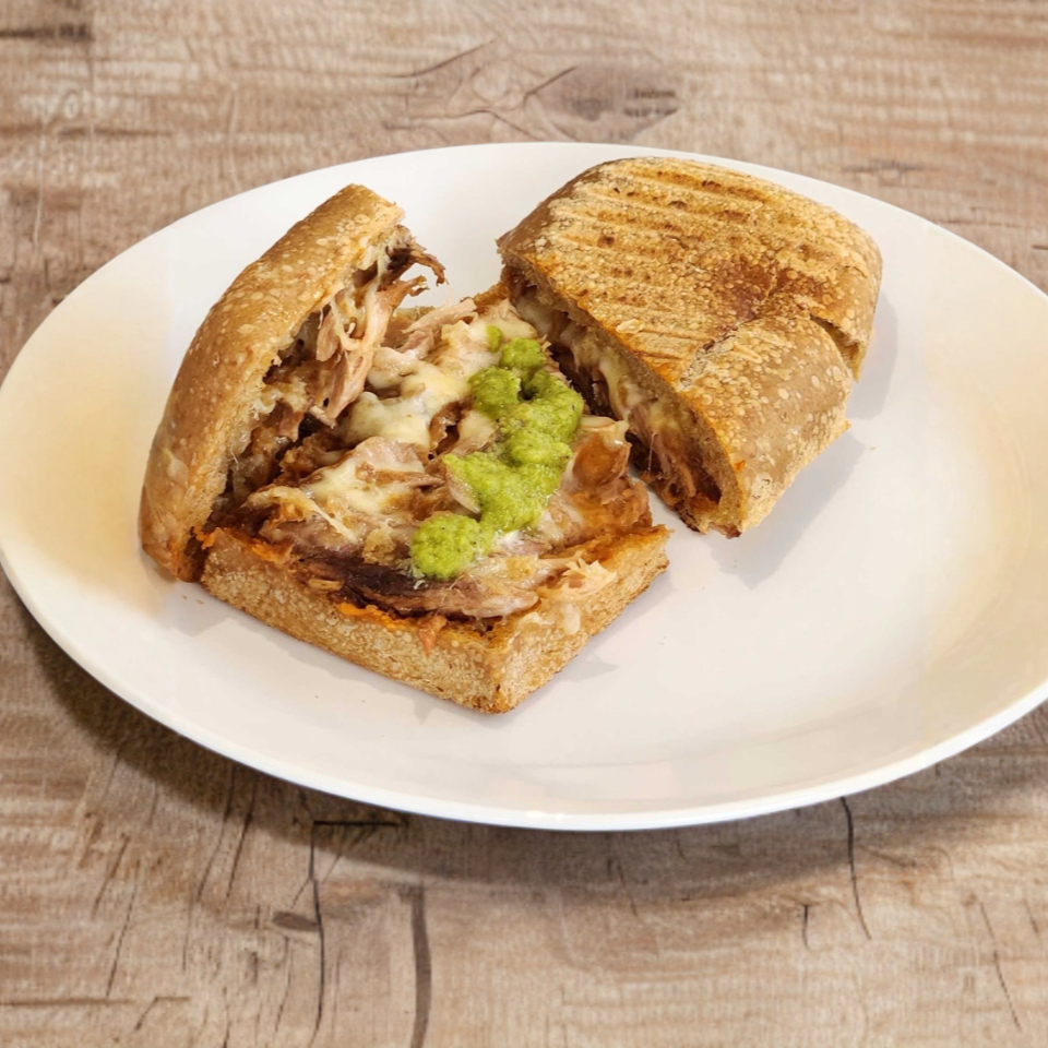Pan de masa madre, chamorro, frijoles, queso cheddar y salsa verde de la casa.