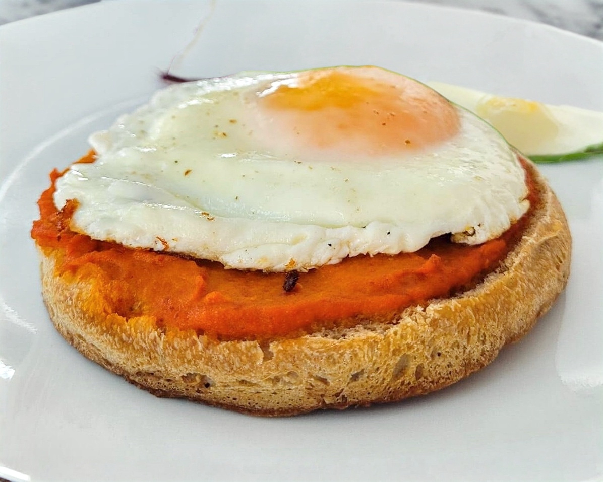Huevo orgánico estrellado sobre una cama de crema de jitomate, pan de masa madre acompañado de lechuga.