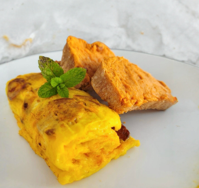 Tortilla de huevo orgánico con chorizo acompañado de pan de masa madre y frijoles refritos de la casa.