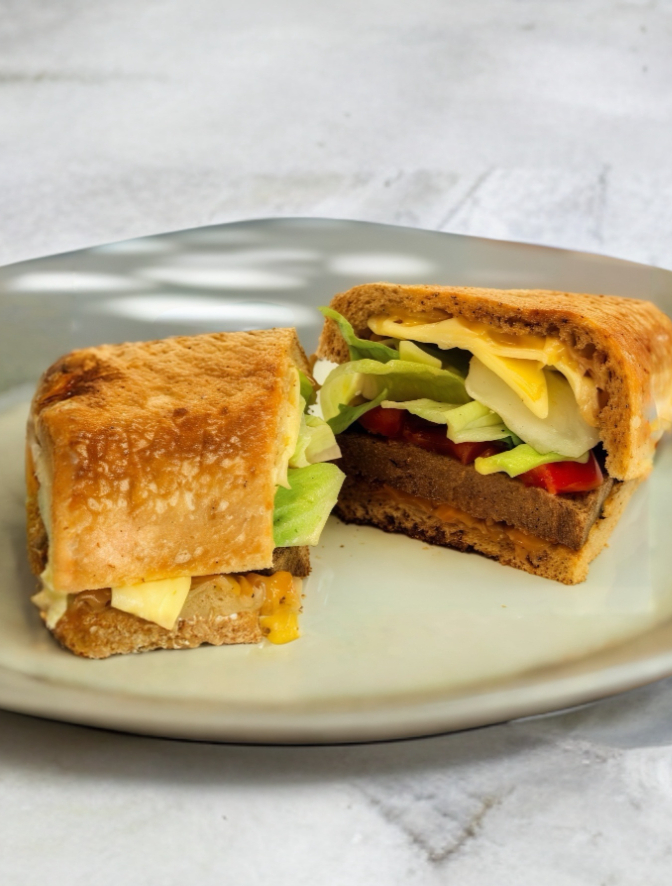 Pan de masa madre, milanesa de res orgánica, frijoles refritos de la casa, queso cheddar lechuga y jitomate.