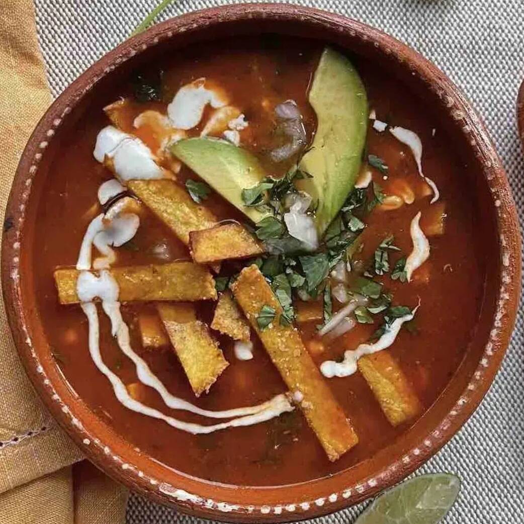 Servida con crujientes tiras de tortilla de maíz, crema, queso, chicharron, aguacate y chile pasilla