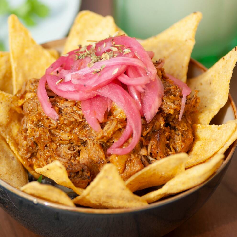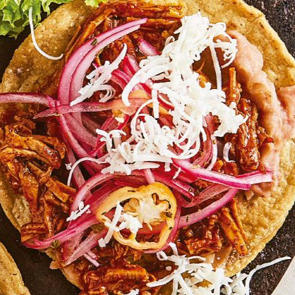 Sope de tortilla de maíz con cochinita pibil, queso, crema, cebolla morada y salsa