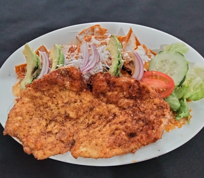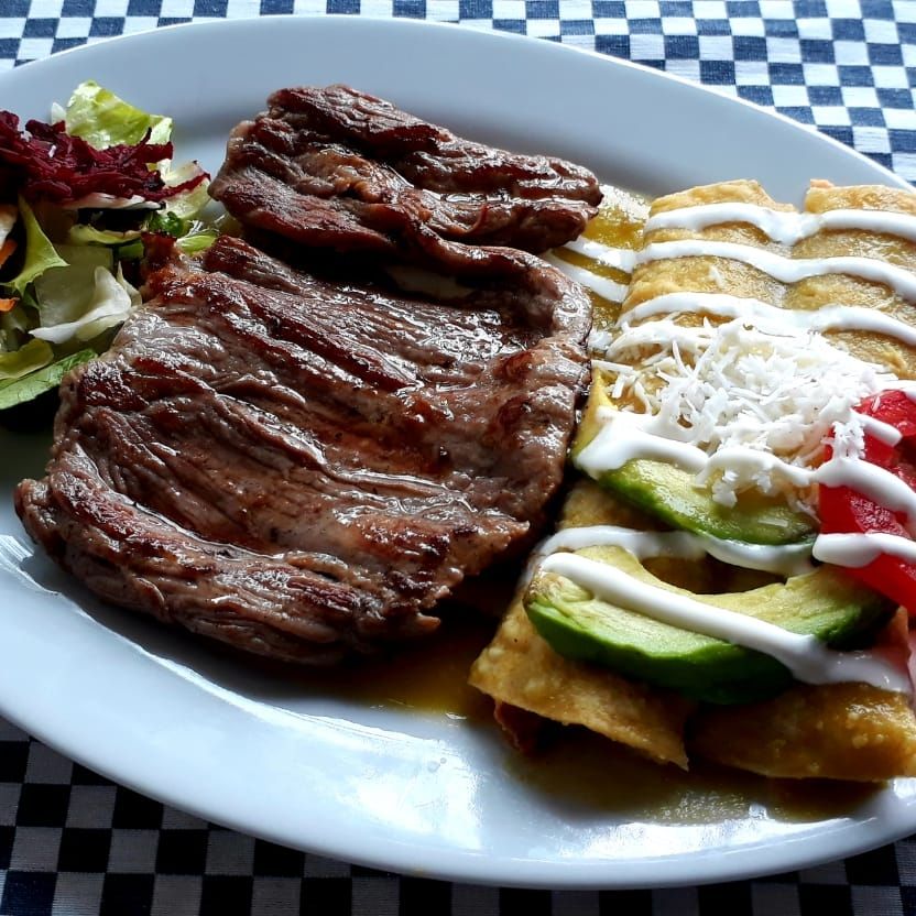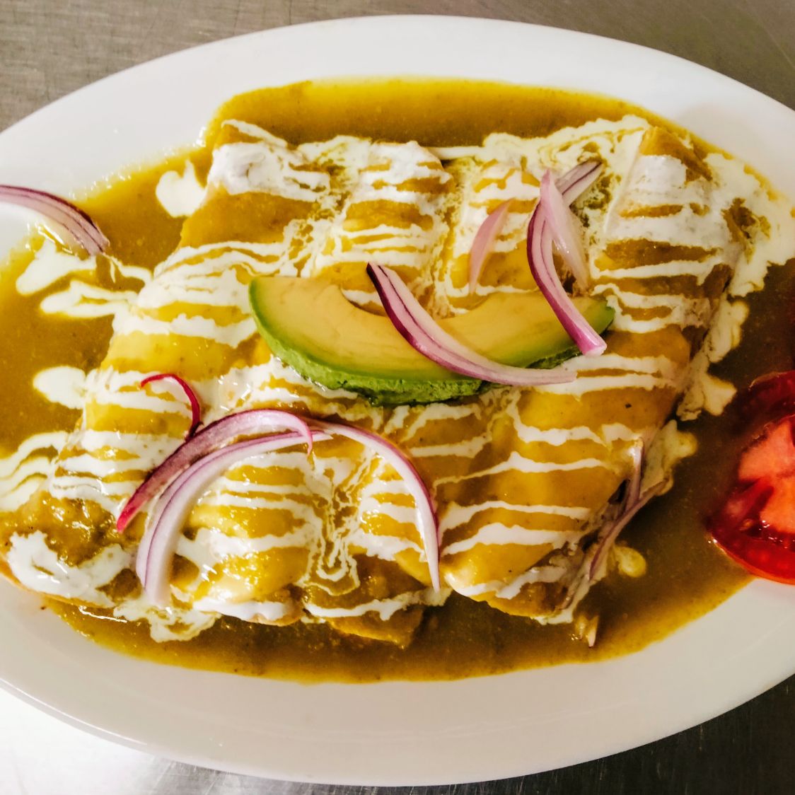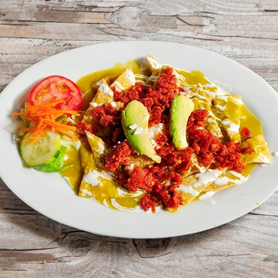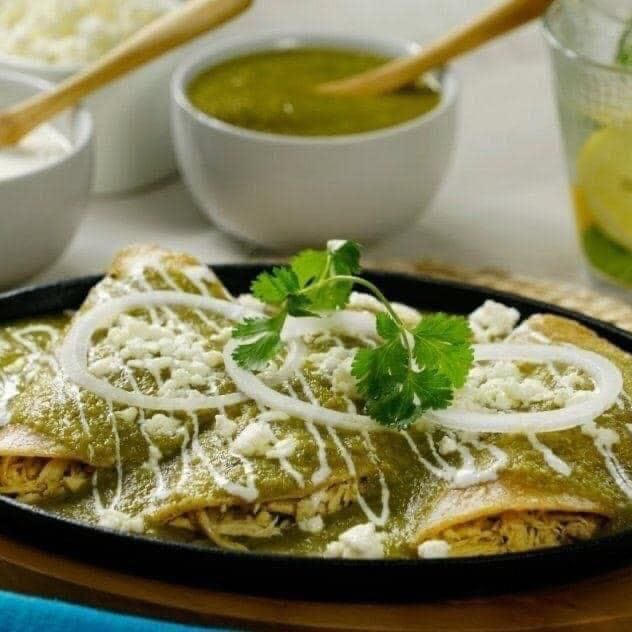4 Pzas de enchiladas rellenas de pollo, bañadas en salsa verde o roja, decoradas con Aguacate, Cebolla, Queso y Crema.