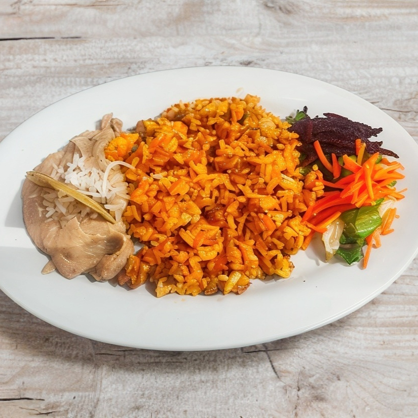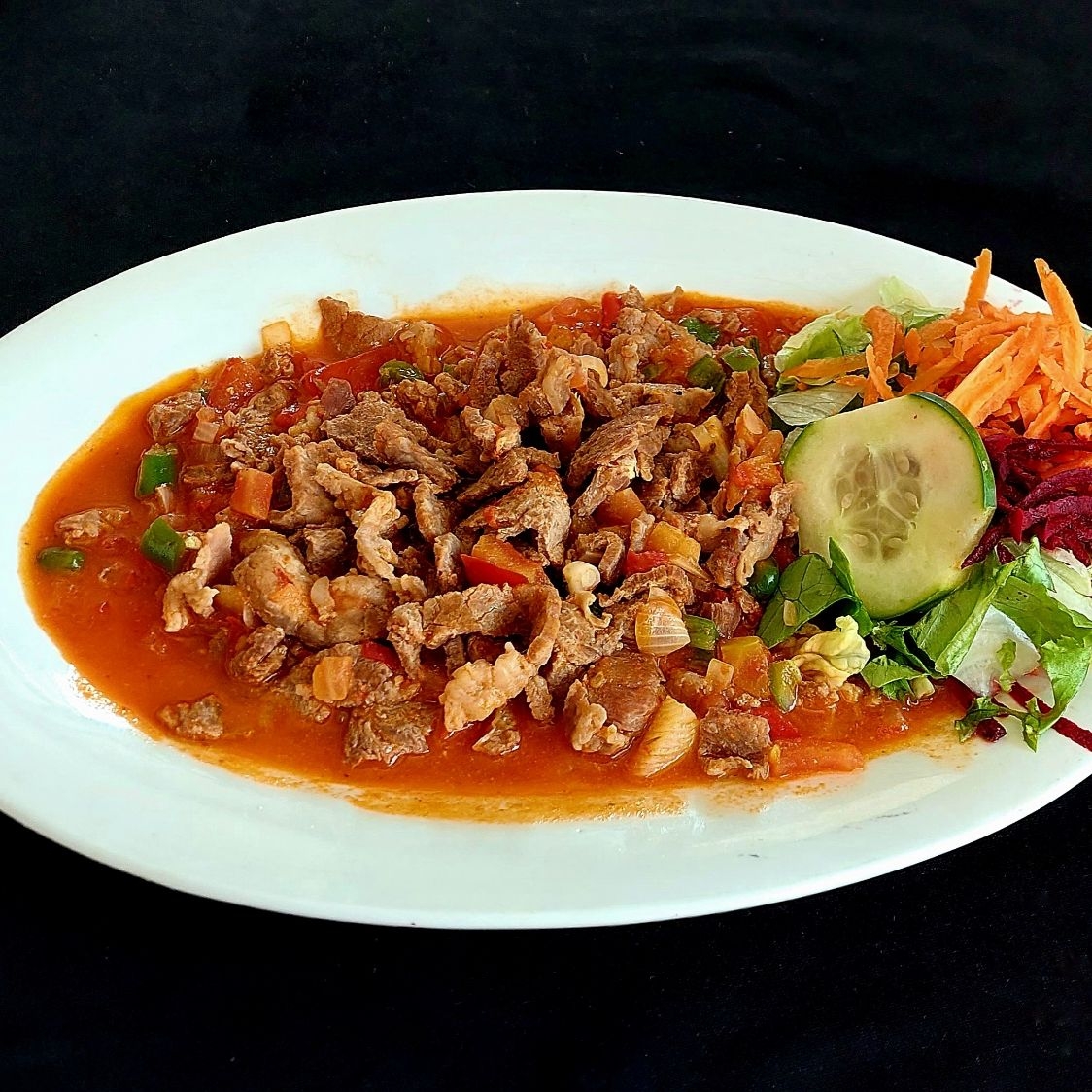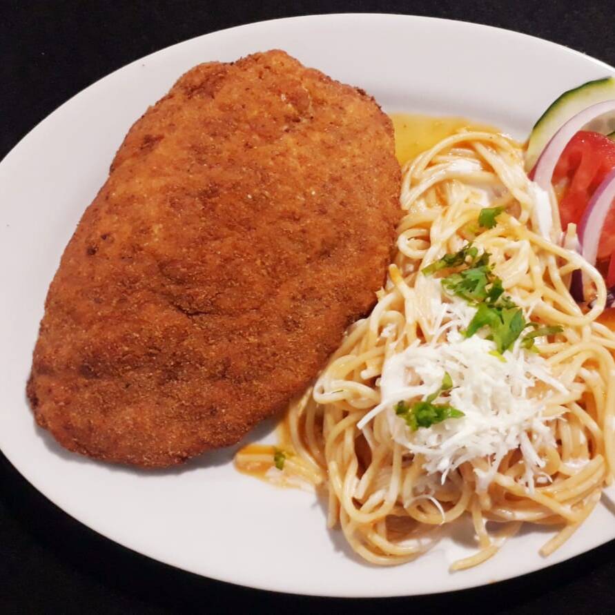 Rellena con jamón y queso. Guarnición a elegir spaguetti, arroz o ensalada. Acompañada con un refresco de sabor al azar.