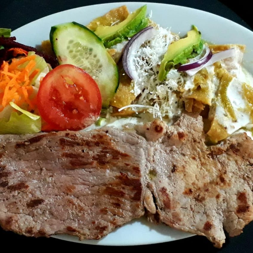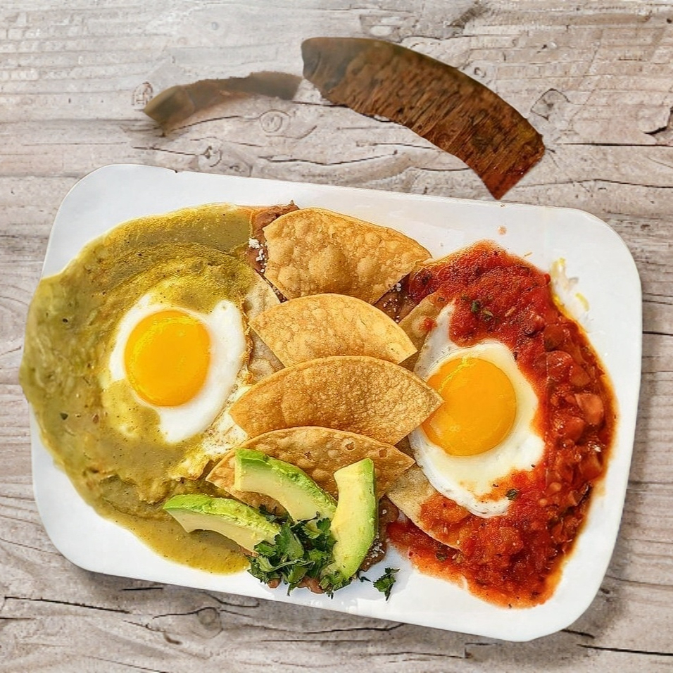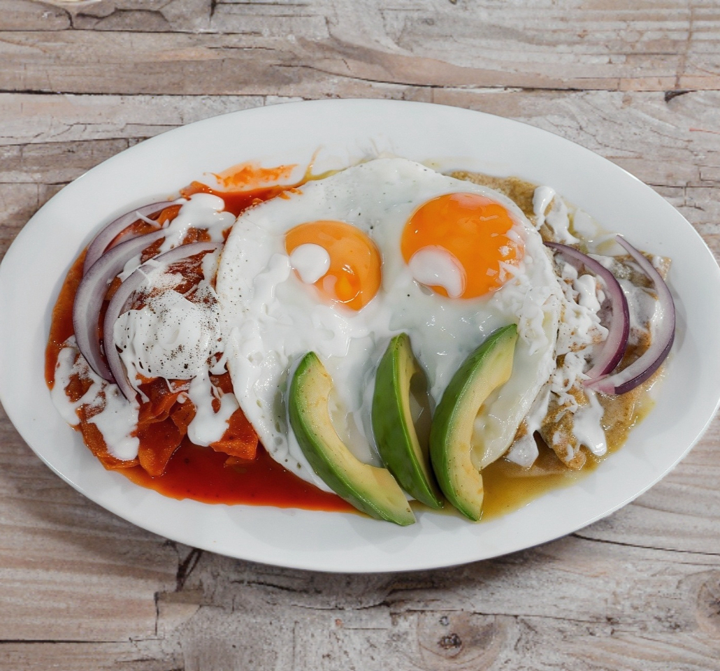 Con chilaquiles bañados con salsa verde o rojo, decorados con Aguacate, Cebolla, Queso y Crema. Acompañada con un refresco de sabor al azar.