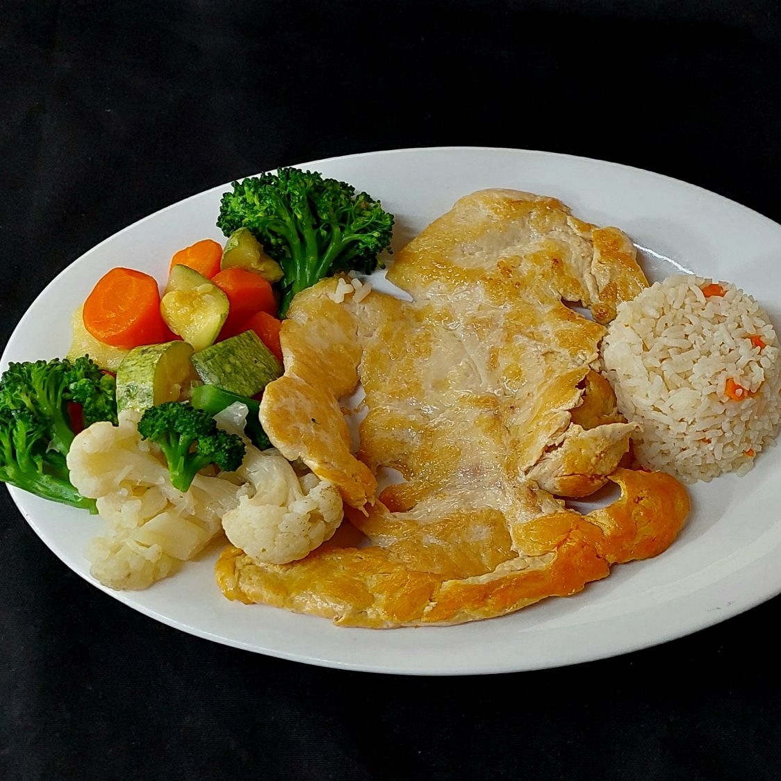 Verduras al vapor: Brócoli, Coliflor, Calabacita y Zanahoria. Acompañada con un refresco de sabor al azar.