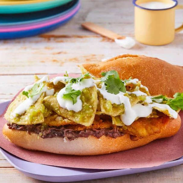 Deliciosa Torta con Frijoles refritos, Chilaquiles Verdes, Fajitas de Milanesa de Pollo, Queso, Cebolla y Crema.