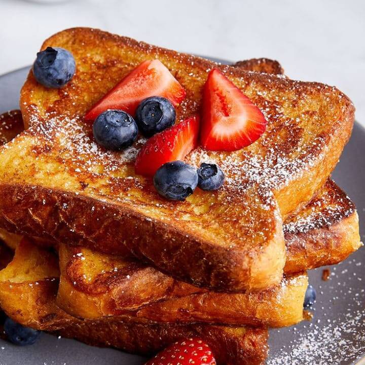 3 Rebanadas de Pan de Caja rebosadas en la mezcla especial de la casa, con Azúcar - Canela, bañadas en miel maple, decoradas con fresas y espolvoreadas de azúcar glass.