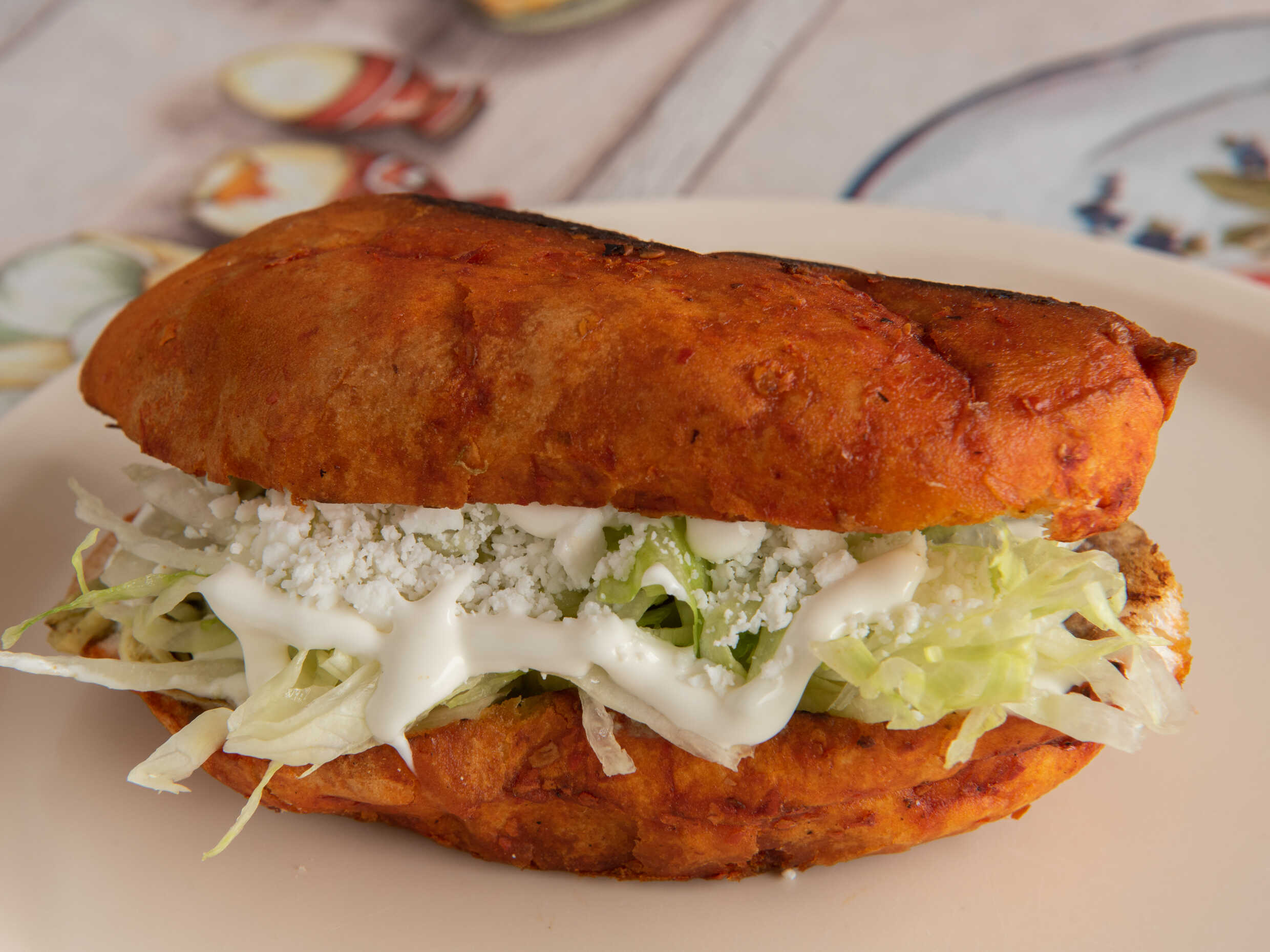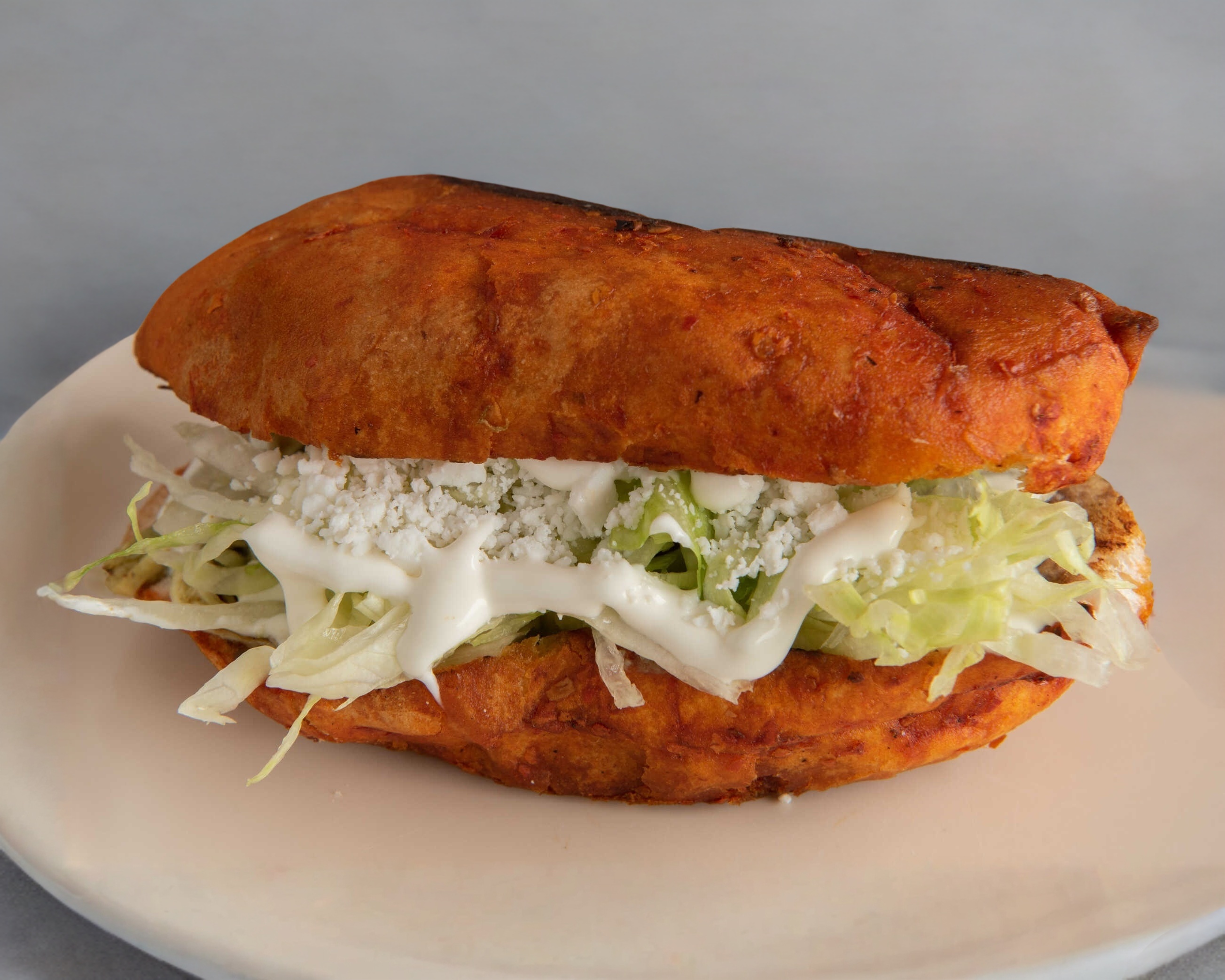 1 Pambazo con pan bolillo, preparado con guisado 50 gramos aproximadamente con mole verde, mole rojo, tinga de pollo, tinga de res, papa con longaniza, longaniza, tinga de res, tinga de pollo, carne al pastor, cochinita, pollo, picadillo, queso crema y lechuga más salsas a elección salsa verde, cacahuate, morita, amarilla de chile manzana.