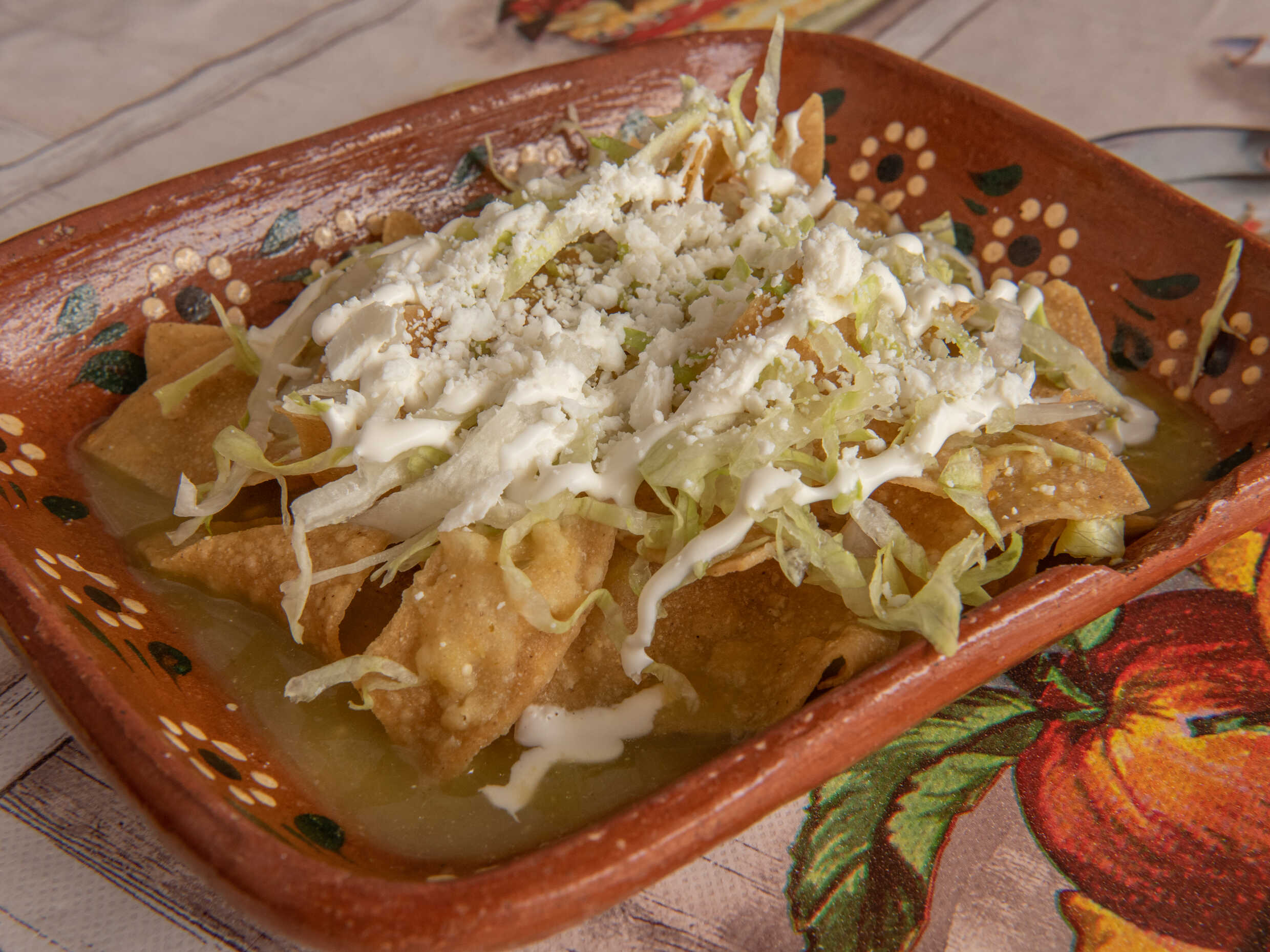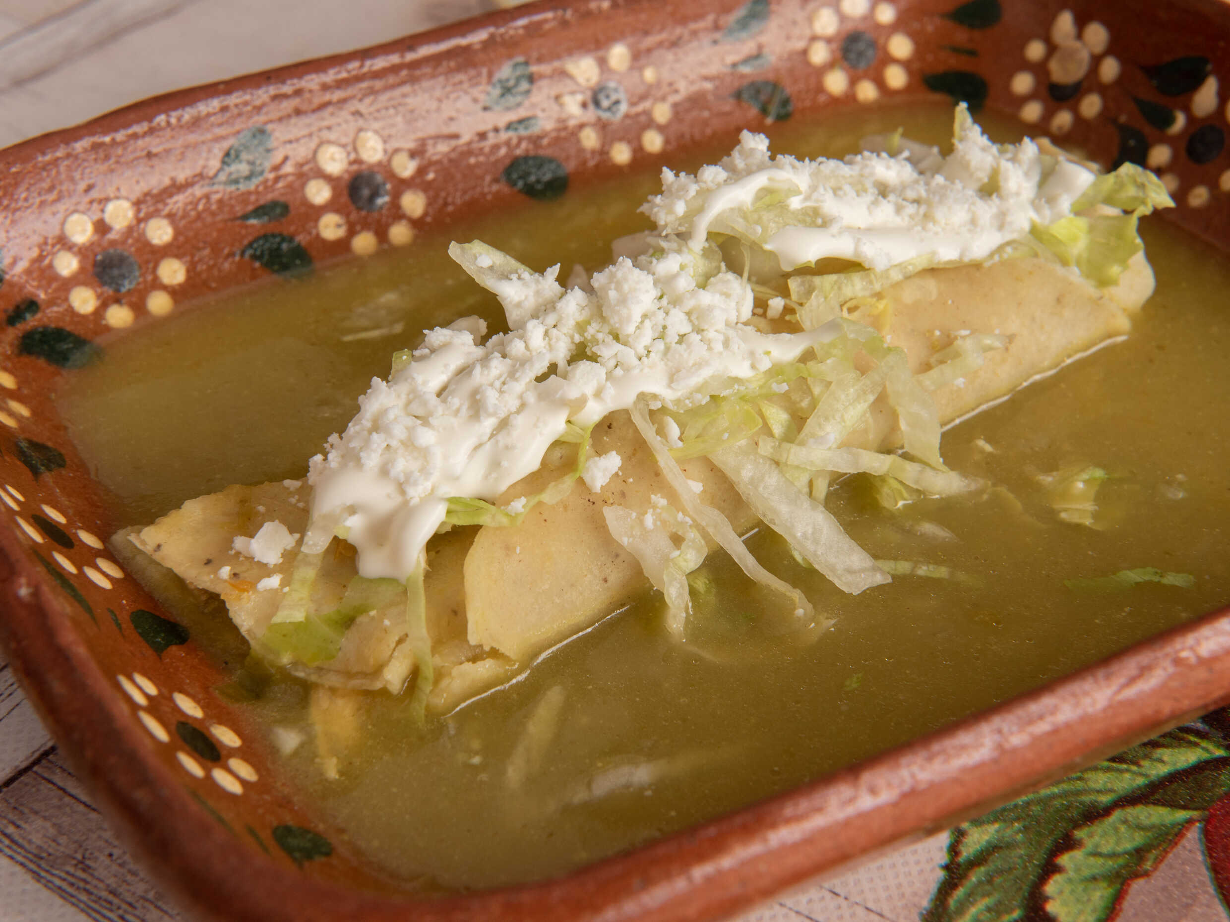 4 Piezas de tacos de su elección con lechuga, queso y crema, ahogados en salsa verde
