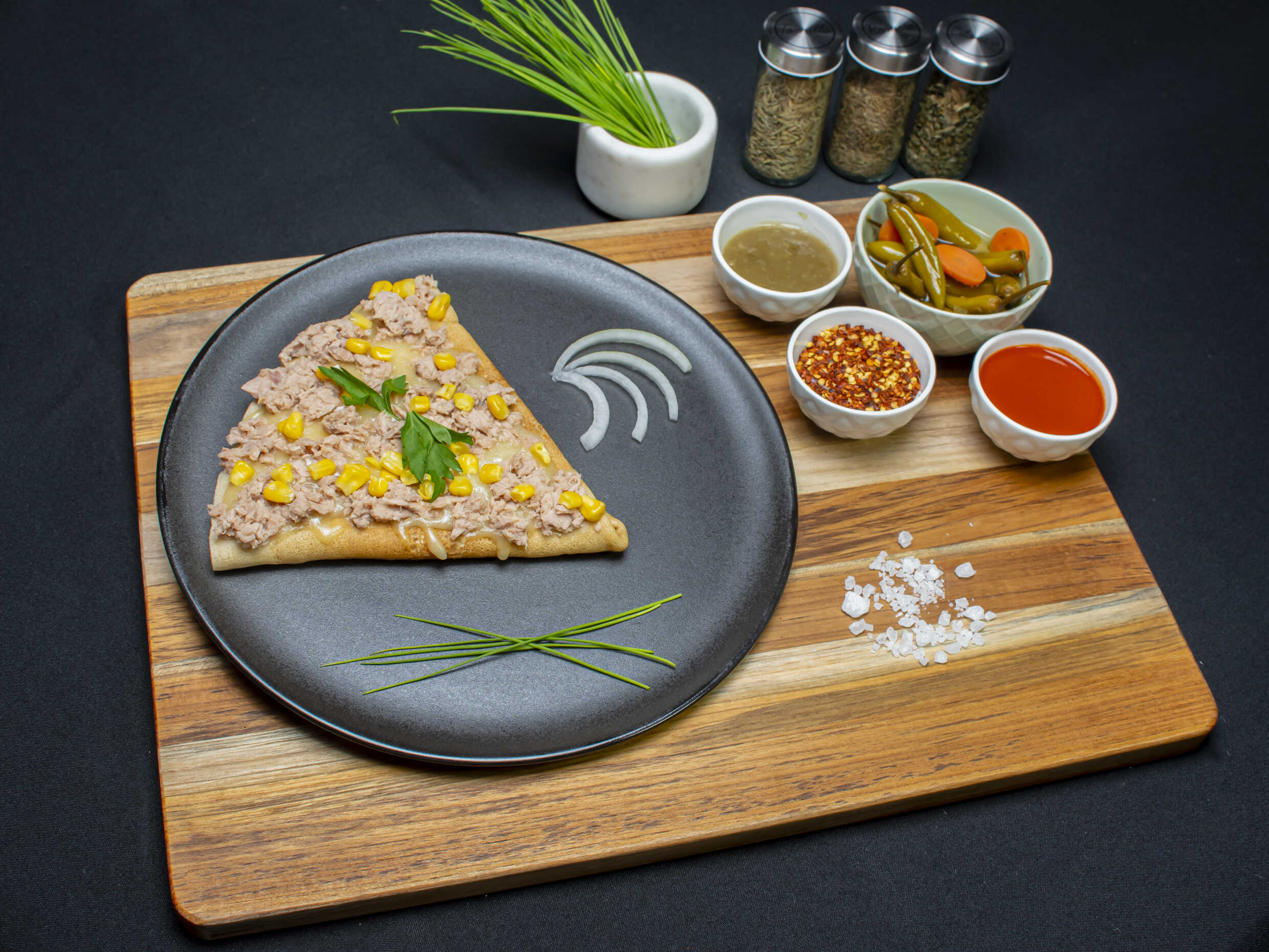Deliciosa crepa acompañada con atún y queso monterrey