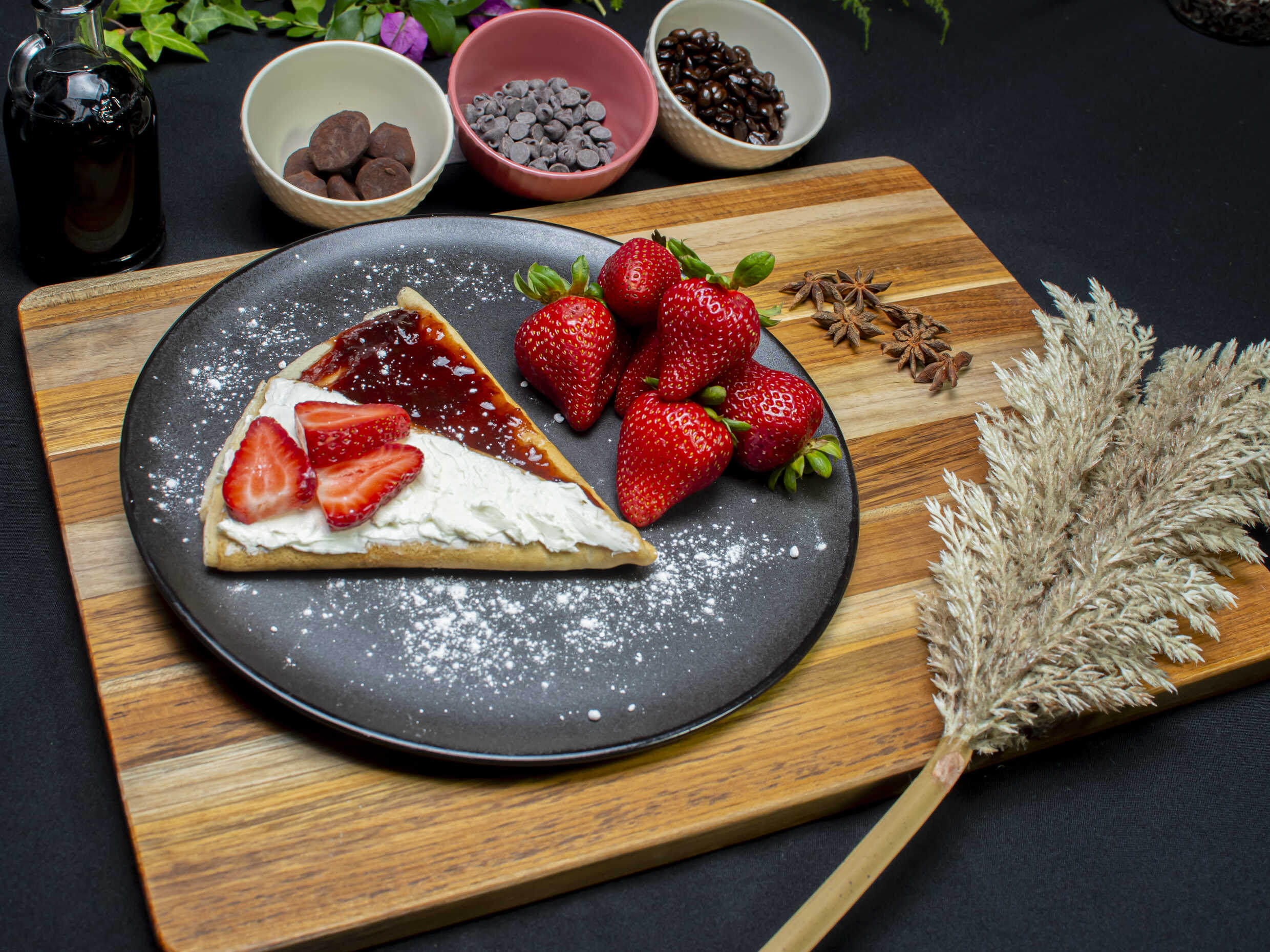 Deliciosa crepa acompañada de mermelada de fresa artesanal y queso philadelphia