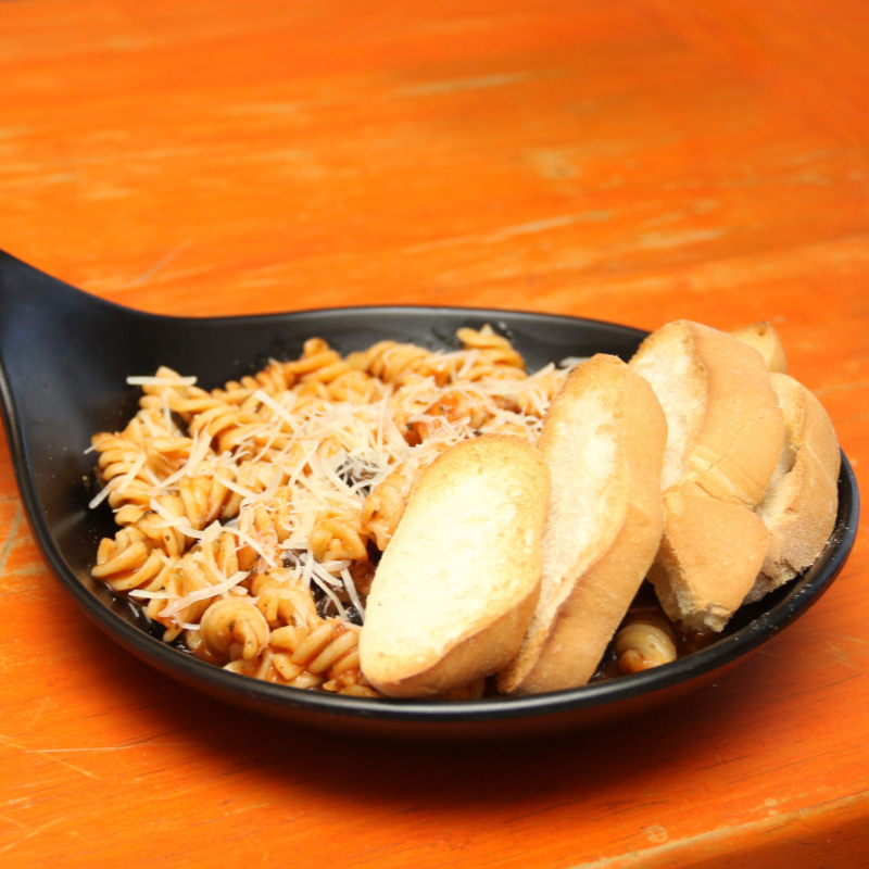 Pasta fusilli con salsa de tomate, aceituna negra y queso parmesano