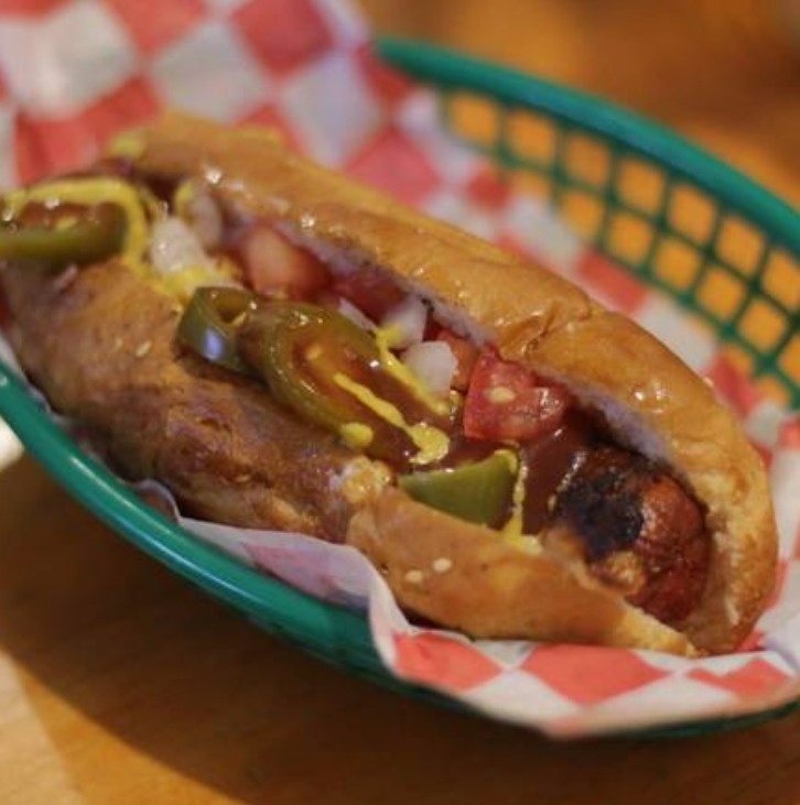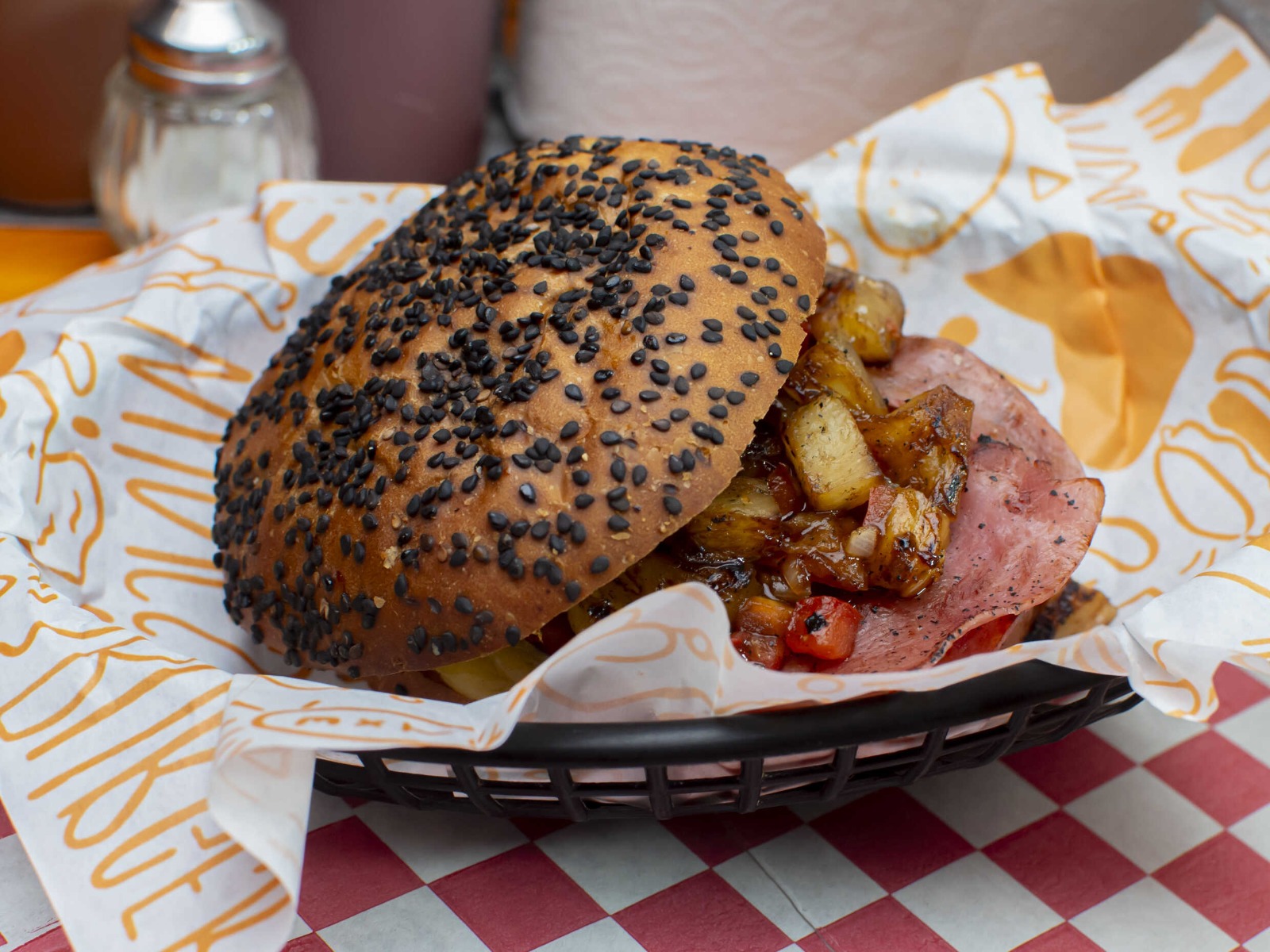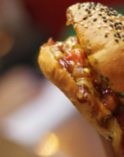 Pan artesanal con ajonjolí, carne de arrachera, queso gouda, cebolla y jitomate asado con BBQ y chiles en vinagre.