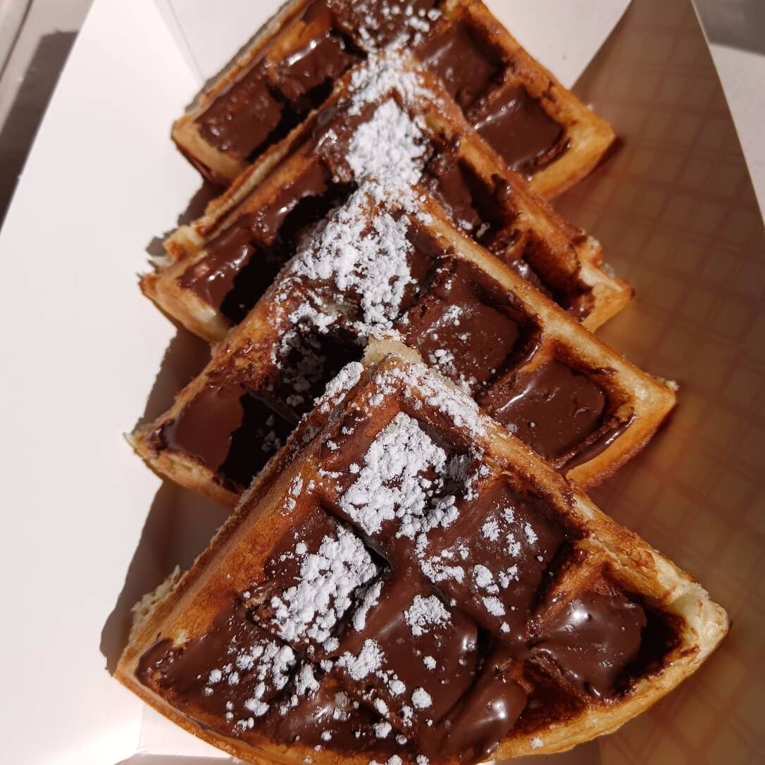Waffle esponjosito con 2 ingredientes a elegir. Espolvoreado con azúcar glas.