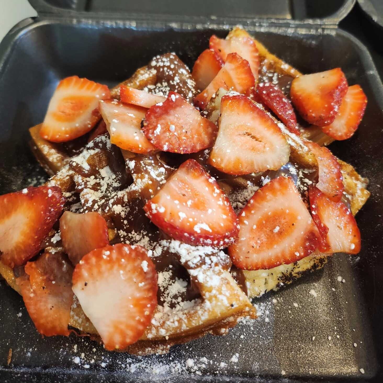 Waffle esponjosito con nutella y fresa, espolvoreado con azúcar glass.