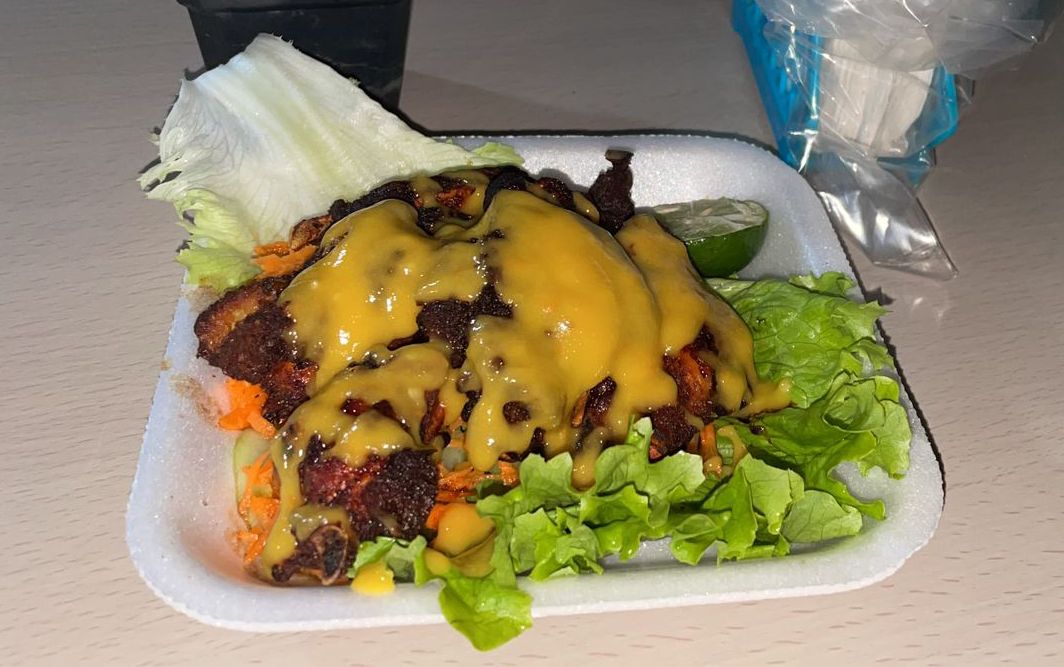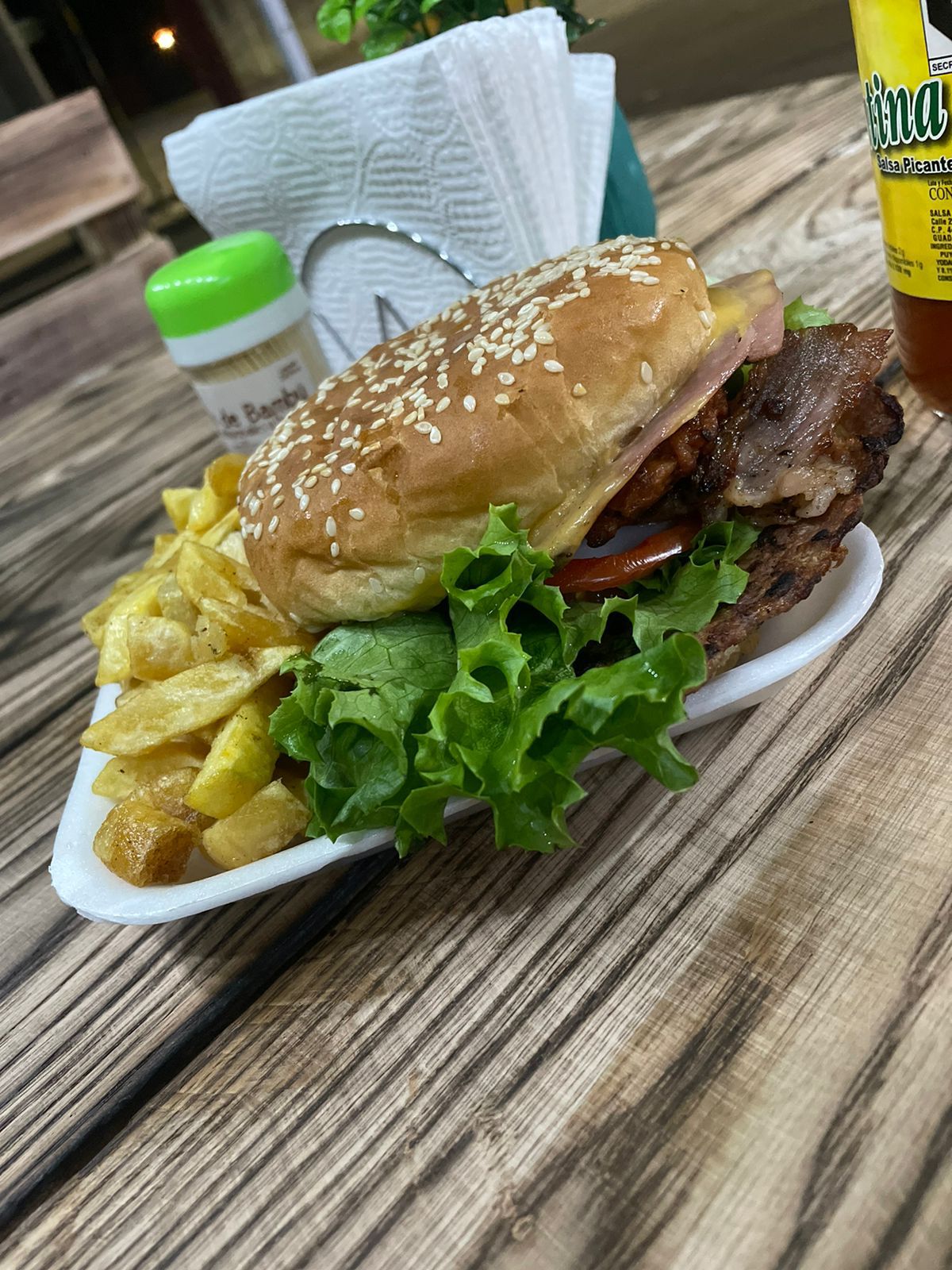 Hamburguesa Ranchera con papas, carne de res, tocino, chorizo, queso amarillo, jamón, mayonesa, lechuga, jitomate, cebolla catsup y mostaza
