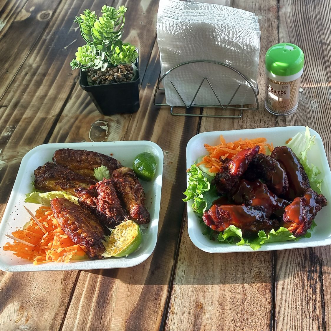 5 Piezas de alitas bañadas en salsa a elegir acompañadas con lechuga, zanahoria rallada, pepino y limón