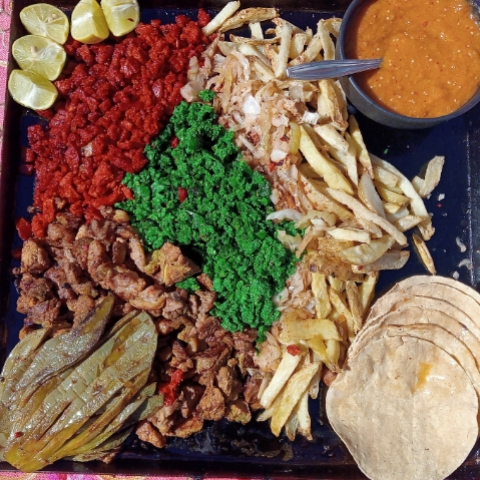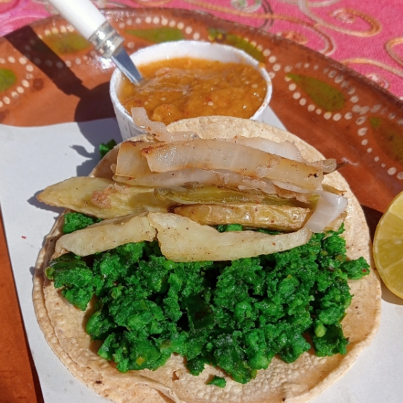 Tortilla de maíz, chorizo verde frito, verdura a elegir, salsa y limones