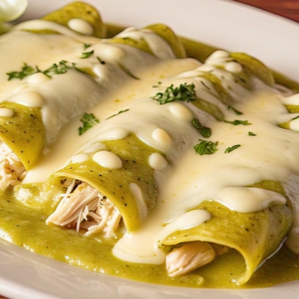 4 enchiladas verdes rellenas de pollo, queso manchego y crema